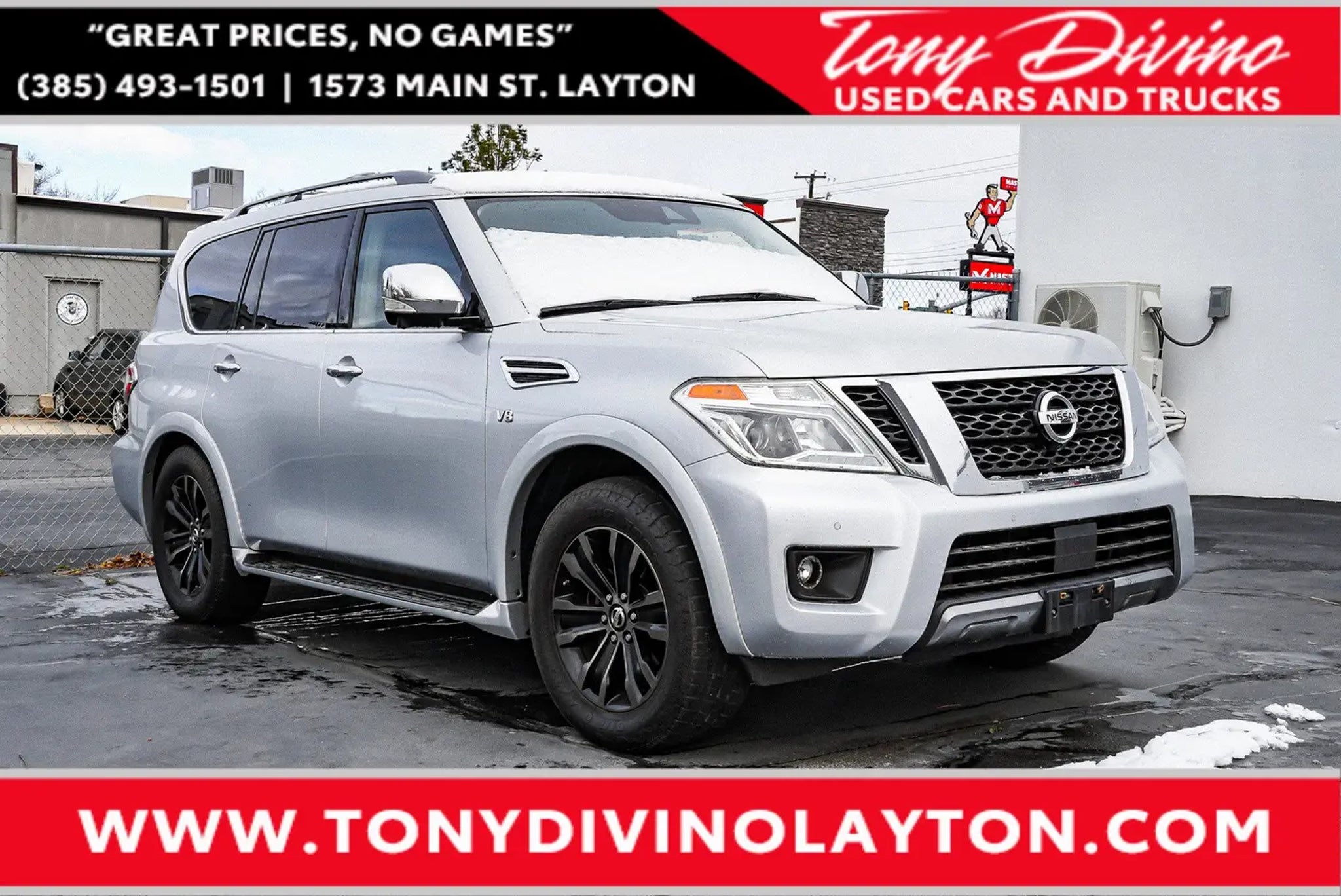 Vehicle located at new Layton location!Tony Divino Used Cars And Trucks 1573 N. Main StreetLayton Utah 84041 This Nissan won't be on the lot long! It just arrived on our lot, and surely won't be here long! Nissan prioritized practicality, efficiency, and style by including: fully automatic headlights, cruise control, and 1-touch window functionality. A 5.6 liter V-8 engine pairs with a sophisticated 7 speed automatic transmission, and load leveling rear suspension maintains a comfortable ride. Four wheel drive allows you to go places you've only imagined. We pride ourselves in the quality that we offer on all of our vehicles. Stop by our dealership or give us a call for more information. * Estimated Monthly Payment will depend on vehicle make and model and will be determined upon actual vehicle inspection. All payments are estimates. Tax, title, registration and documentation fee ($349) are extra.* While every reasonable effort is made to ensure the accuracy of this information, we are not responsible for any errors or omissions contained on these pages. Please verify any information in question with Tony Divino Toyota.