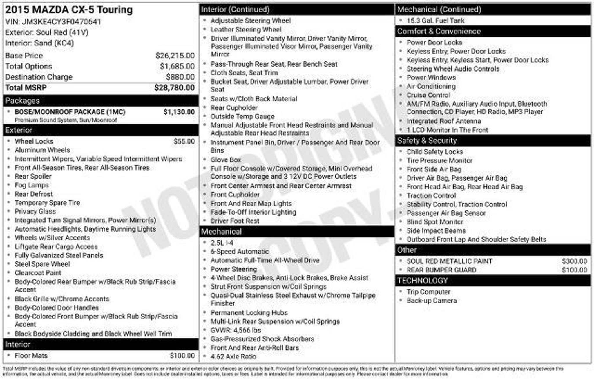 Details > 2015 Mazda CX-5 AWD Touring 4DR SUV For Sale in Bow, NH Private Party Sellers Click here to place your ad now! You auta tell them you saw the ad in AutaBuy when you call or email. 1/22 2/22 3/22 4/22 5/22 6/22 7/22 8/22 9/22 10/22 11/22 12/22 13/22 14/22 15/22 16/22 17/22 18/22 19/22 20/22 21/22 22/22 View 22 Photos View All Add to My Garage Parked in Your Garage! Grappone Ford Contact Seller: I would like to: Make Offer Check Availability Ask A Question Request More Photos Check Financing Options Send a copy of this message to me Add this listing to my garage Send to Mobile Mileage 99,377 Exterior Color Soul Red Metallic Interior Color Unknown Doors 4 Engine 2.5L I4 Transmission 6 Speed Auto Stock # MQ0631A VIN JM3KE4CY3F0470641 Estimated Monthly Payment $214 mo Apply Now J.J. Best Banc & Co. 2015 Mazda CX-5 AWD Touring 4DR SUV Description: 2015 Mazda CX-5 Touring Soul Red Metallic *GRAPPONE PEACE OF MIND* 3 day money back guarantee and 30 day/1,000 mile exchange**Upfront pricing, all the time on every vehicle. 3 month/3000 mile warranty. Free Carfax and 129 point inspection. · Mileage: 99,377 · Color: Soul Red Metallic Price: $12,300. Mileage 99,377 Exterior Color Soul Red Metallic Interior Color Unknown Doors 4 Engine 2.5L I4 Transmission 6 Speed Auto Stock # MQ0631A VIN JM3KE4CY3F0470641 Estimated Monthly Payment $214 mo Apply Now J.J. Best Banc & Co. Add to My Garage Parked in Your Garage! Message Seller Grappone Ford Contact Seller: I would like to: Make Offer Check Availability Ask A Question Request More Photos Check Financing Options Send a copy of this message to me Add this listing to my garage Offered for sale by Grappone Ford BOW, NH Price: $12,300. Offered for sale by Grappone Ford BOW, NH [entire inventory] Ask Auta Intelligence The first collector-car AI built directly into a classic car marketplace How many of these were produced? What transmission options did these offer? How many CX-5s were produced in Red? What kind of mileage do these get? What does this VIN number tell me? What factory options were available on this model? What trim levels were available for this model? What colors did these come in? Can you show me more suvs for a similar price? Tell me more about this model When was this model first introduced? What safety features does this model offer? Where is this located? What engine options did these come with? How far is this from me? How easy are parts to find for this model? How many passengers can this seat comfortably? Do you have a similar car to sell? List It Now! Questions about this car? Ask Auta Intelligence for production numbers, available options, etc. · Subscribe to AutaBuy! · Send a Gift Subscription Notice to a Friend