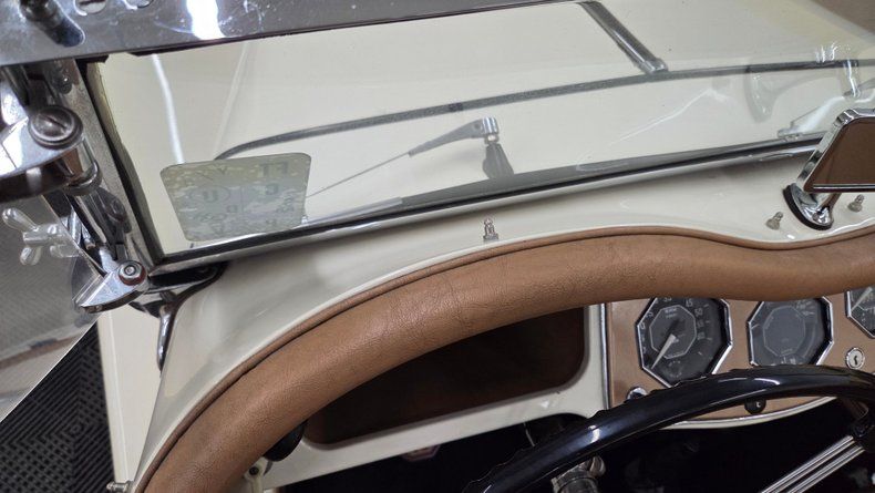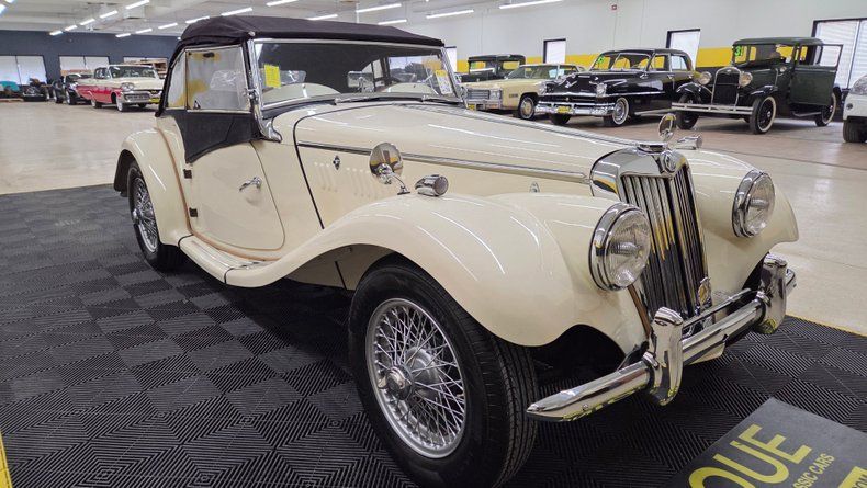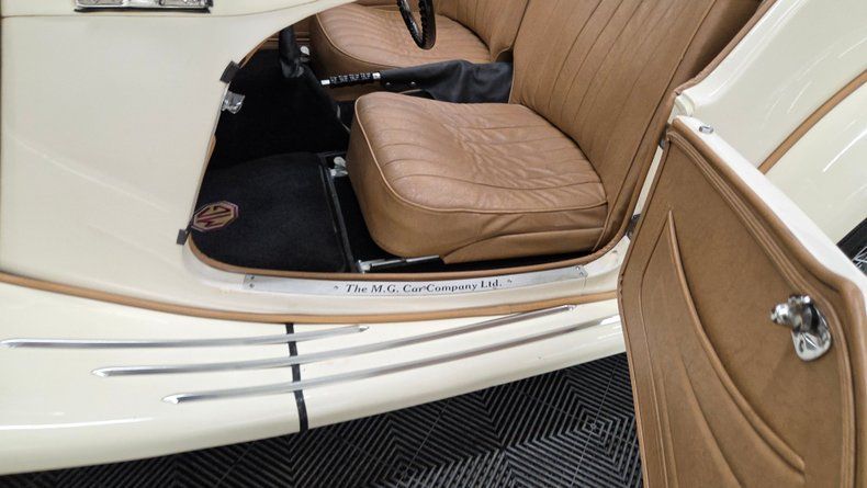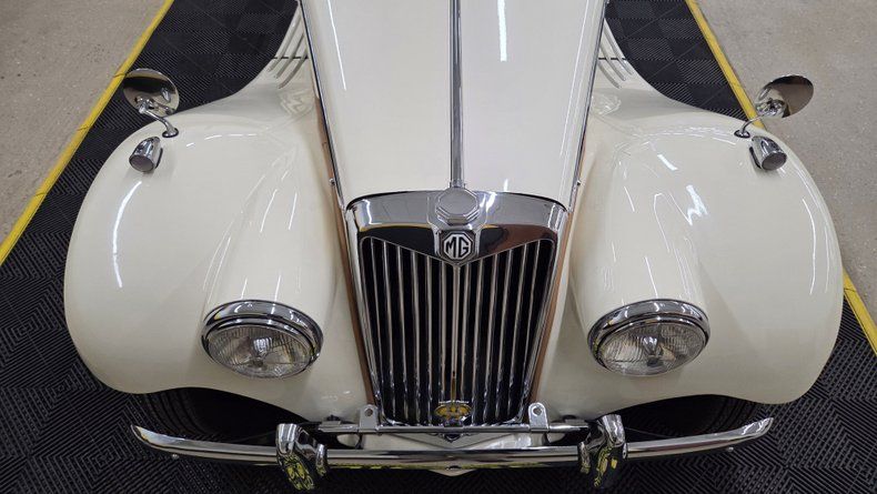 1954 MG TF. Unlike many replicas or kit cars, this MG TF is the real deal, featuring an inline four-cylinder engine mounted in the front and a full steel body, distinguishing it from replicas. The car is painted in a cream/off-white color with a tan interior, complemented by chrome brightwork and wire-spoked wheels with knockoffs. A shifter is mounted on the floor for the four speed manual transmission. Overall a well-maintained and shiny finish with few imperfections. Included with the car are accessories such as side curtains (windows), storage bags, a cockpit cover, a car cover, and manuals for both workshop and restoration purposes. The rear features a mounted spare tire matching the wire wheels, and the car has "suicide" doors that open opposite the standard direction. Recent service includes new front brake shoes, and new front wheel cylinders. The inner tie rods could use attention and the speedometer and odometer are not operational. The engine starts easily with a choke (for cold starts) and manual starter pull mechanism. The manual folding convertible black fabric top folds well and the the side curtains slide into place as they should. The engine is equipped with dual carburetors and under the hood is a toolbox with necessary tire-changing tools such as a mallet and jack. On the road, the MG TF shows good drivability with smooth running, responsive handling, and comfortable accommodation even for a taller driver. Gauges such as water temperature, oil pressure, tachometer, and ammeter are reading.