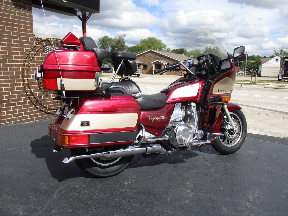 The Kawasaki Voyager debuted in 1986 as a fully dressed touring motorcycle, designed to rival Hondas Gold Wing with long-distance comfort, integrated luggage and advanced electronics. The 2001 Kawasaki Voyager XII (ZG1200) is a full-dress touring motorcycle powered by a 1,196cc liquid-cooled, inline-four engine with DOHC and four valves per cylinder. It uses a 5-speed transmission and shaft drive, has a large fairing, comfortable seating and weighs in with a wet weight of 799 lbs. This particular example was optioned in a gorgeous Vintage Red and Pearl Beige that still looks amazing. It has been nicely upgraded with a driver backrest that has a storage pouch in the rear, driver floor boards, a heel to toe shifter and it sounds amazing ripping through its true dual performance exhaust with dual tips on both sides. It was last serviced less than 1,000 miles ago at which time both tires were replaced. The previous owner was planning to change the brake pads but realized that the owner prior to him had just done it and they had too much life left to remove them. The 3 sets of new pads he was planning to install are included as well as the needed gaskets for the next service, the original toe shifter, a waterproof storage cover, the original color matched saddle bag and trunk liners with Voyager logos and the original owners manual for the bike and Clarion PK-9090V stereo system. The are few scratches here and there and there is some discoloration on the windshield but overall