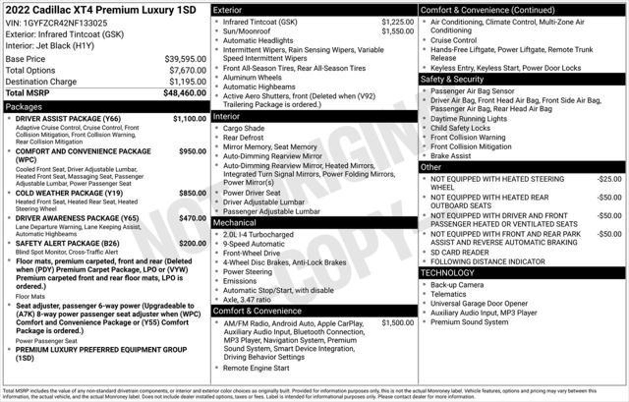 Elevate your driving experience with this stunning 2022 Cadillac XT4 Premium Luxury. This exceptional SUV boasts a captivating Red exterior and a wealth of premium features that will leave you thoroughly impressed. - CLEAN CARFAX! - POWER SUNROOF/ MOONROOF - PREMIUM LEATHER INTERIOR - HEATED SEATS - HEATED STEERING WHEEL - APPLE CARPLAY / ANDROID AUTO - SIRIUS XM SATELLITE RADIO - BOSE PREMIUM AUDIO PACKAGE - REMOTE ENGINE START - REAR BACKUP CAMERA - FACTORY ALLOY WHEELS - ADAPTIVE CRUISE CONTROL WITH STOP & GO!! Indulge in the unparalleled comfort and convenience of this Cadillac XT4. The Cadillac User Experience with Embedded Navigation provides seamless connectivity, while the Bose Centerpoint Surround Sound 13-speaker audio system delivers an immersive listening experience. Stay connected with wireless Apple CarPlay and Android Auto, and enjoy the added security of the Reverse Automatic Braking system. Designed with your safety in mind, this XT4 is equipped with a suite of advanced driver-assistance technologies. The Driver Awareness Package includes features like Lane Keep Assist, Lane Departure Warning, and the impressive IntelliBeam automatic high beam control. The Safety Alert Package further enhances your peace of mind with Lane Change Alert, Side Blind Zone Alert, and Rear Cross Traffic Alert. Comfort and convenience are at the forefront, with the Comfort and Convenience Package offering ventilated front seats, power lumbar massage, and a heated steering wheel. The Cold Weather Package ensures you stay warm and cozy, even on the chilliest days, with heated front and rear seats. This 2022 Cadillac XT4 Premium Luxury is a true standout in its class, blending exceptional style, advanced technology, and uncompromising performance. With its turbocharged 2.0L I4 engine and 9-speed automatic transmission, this SUV delivers an exhilarating driving experience while maintaining impressive fuel efficiency of 24 city/30 highway MPG. We want to ensure you have all the details you need! Our pricing and information are presented with utmost accuracy. Please keep in mind that prices and incentives can vary depending on your location, and they are subject to change. It's important to note that government fees such as tax, tag, title, and WRA are not included in our prices. At Nissan of Lithia Springs, we proudly offer automotive loan financing through our esteemed Finance Department. Contact one of our dedicated finance managers to learn more about our Credit Assistance Program. Our exceptional team of sales and finance associates is committed to providing top-notch care and addressing all your automotive concerns with the utmost dedication. Visit our dealership at 811 Thornton Rd, Lithia Springs, GA, or call us at . We are looking forward to assisting all our customers in the greater Atlanta area with great enthusiasm and sincerity.