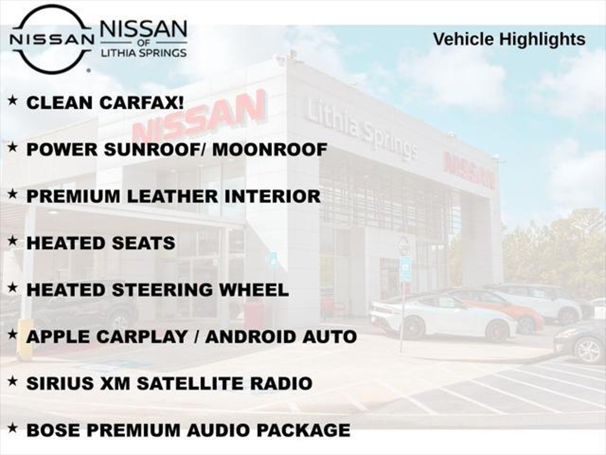 Elevate your driving experience with this stunning 2022 Cadillac XT4 Premium Luxury. This exceptional SUV boasts a captivating Red exterior and a wealth of premium features that will leave you thoroughly impressed. - CLEAN CARFAX! - POWER SUNROOF/ MOONROOF - PREMIUM LEATHER INTERIOR - HEATED SEATS - HEATED STEERING WHEEL - APPLE CARPLAY / ANDROID AUTO - SIRIUS XM SATELLITE RADIO - BOSE PREMIUM AUDIO PACKAGE - REMOTE ENGINE START - REAR BACKUP CAMERA - FACTORY ALLOY WHEELS - ADAPTIVE CRUISE CONTROL WITH STOP & GO!! Indulge in the unparalleled comfort and convenience of this Cadillac XT4. The Cadillac User Experience with Embedded Navigation provides seamless connectivity, while the Bose Centerpoint Surround Sound 13-speaker audio system delivers an immersive listening experience. Stay connected with wireless Apple CarPlay and Android Auto, and enjoy the added security of the Reverse Automatic Braking system. Designed with your safety in mind, this XT4 is equipped with a suite of advanced driver-assistance technologies. The Driver Awareness Package includes features like Lane Keep Assist, Lane Departure Warning, and the impressive IntelliBeam automatic high beam control. The Safety Alert Package further enhances your peace of mind with Lane Change Alert, Side Blind Zone Alert, and Rear Cross Traffic Alert. Comfort and convenience are at the forefront, with the Comfort and Convenience Package offering ventilated front seats, power lumbar massage, and a heated steering wheel. The Cold Weather Package ensures you stay warm and cozy, even on the chilliest days, with heated front and rear seats. This 2022 Cadillac XT4 Premium Luxury is a true standout in its class, blending exceptional style, advanced technology, and uncompromising performance. With its turbocharged 2.0L I4 engine and 9-speed automatic transmission, this SUV delivers an exhilarating driving experience while maintaining impressive fuel efficiency of 24 city/30 highway MPG. We want to ensure you have all the details you need! Our pricing and information are presented with utmost accuracy. Please keep in mind that prices and incentives can vary depending on your location, and they are subject to change. It's important to note that government fees such as tax, tag, title, and WRA are not included in our prices. At Nissan of Lithia Springs, we proudly offer automotive loan financing through our esteemed Finance Department. Contact one of our dedicated finance managers to learn more about our Credit Assistance Program. Our exceptional team of sales and finance associates is committed to providing top-notch care and addressing all your automotive concerns with the utmost dedication. Visit our dealership at 811 Thornton Rd, Lithia Springs, GA, or call us at . We are looking forward to assisting all our customers in the greater Atlanta area with great enthusiasm and sincerity.