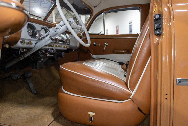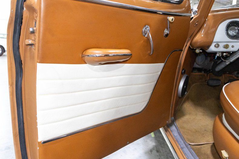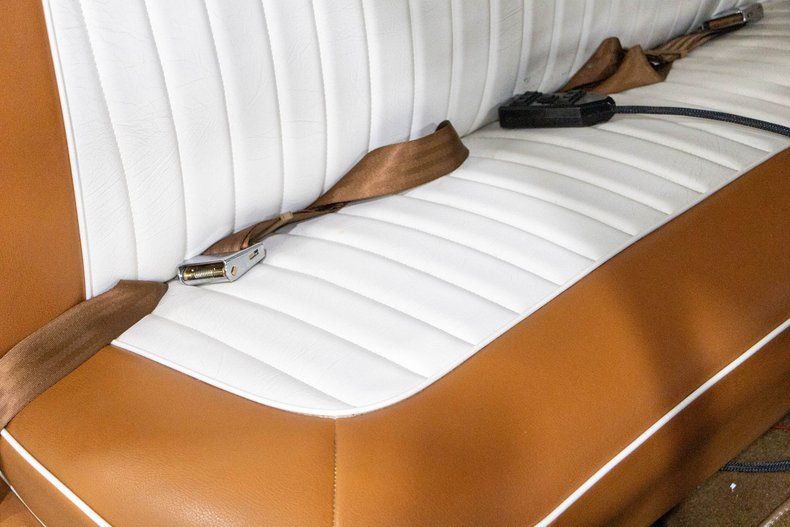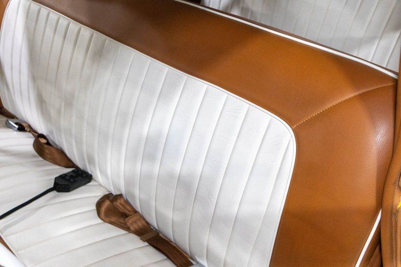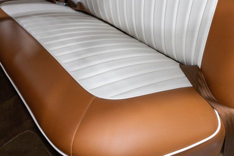 Inside, the cabin has been beautifully refreshed with a brand-new two-tone caramel brown and white interior that perfectly complements the exterior color scheme. Both the front and rear feature comfortable leather bench seats, maintaining the traditional feel of a 1950s sedan while adding a fresh and upscale appearance. The interior presents extremely well and provides plenty of room for passengers to relax and enjoy the ride.