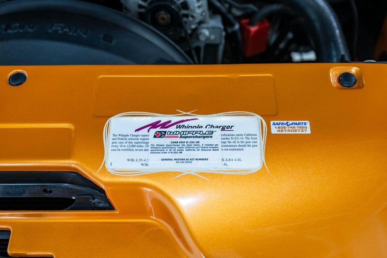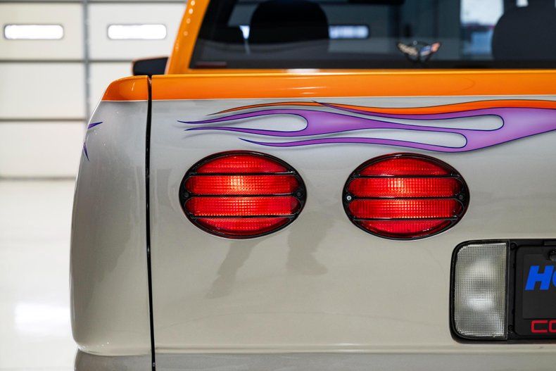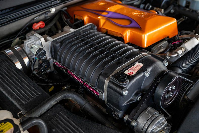 For example, it features a high-end Whipple Supercharger system with matching Whipple EFI The entire system, including the ceramic-coated headers, are CARB-legal in all 50 states. The exterior received many styling upgrades as well, including a hydraulically actuated fiberglass tonneau cover with molded-in rear spoiler, a flush tailgate featuring Corvette taillights, a louvered lower valence panel, and a steel cowl-induction hood, all finished with a show-quality custom paint job featuring multi-color candy flame accents and color fades. The interior received custom-stitched leather with Corvette-Logo embroidered seats, along with custom door panels stitched with flame graphics to match the exterior.