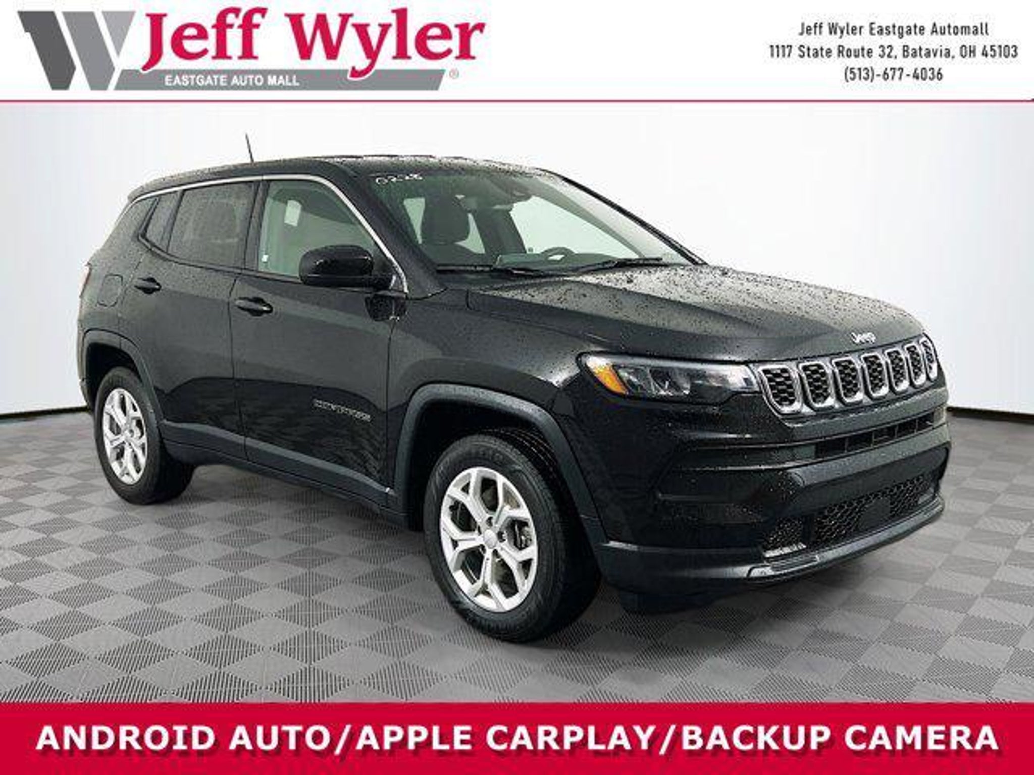 Jeff Wyler Eastgate Auto Mall is pleased to offer this handsome 2024 Jeep Compass Sport in Diamond Black Crystal Pearlcoat. Well equipped with: Quick Order Package 29A, 17 x 7 Aluminum Wheels, 3.73 Final Drive Ratio, 4-Wheel Disc Brakes, 6 Speakers, ABS brakes, Air Conditioning, Alloy wheels, AM/FM radio: SiriusXM, Brake assist, Bumpers: body-color, Cloth Low-Back Bucket Seats, Compass, Delay-off headlights, Driver door bin, Driver vanity mirror, Dual front impact airbags, Dual front side impact airbags, Electronic Stability Control, Emergency communication system: Jeep Connect, Four wheel independent suspension, Front anti-roll bar, Front Bucket Seats, Front Center Armrest w/Storage, Front License Plate Bracket, Front reading lights, Fully automatic headlights, Heated door mirrors, Illuminated entry, Knee airbag, Leather steering wheel, Low tire pressure warning, Occupant sensing airbag, Outside temperature display, Overhead airbag, Overhead console, Panic alarm, ParkView Rear Back-Up Camera, Passenger door bin, Passenger vanity mirror, Power door mirrors, Power steering, Power windows, Radio: Uconnect 5 w/10.1 Display, Rear anti-roll bar, Rear seat center armrest, Rear window defroster, Rear window wiper, Remote keyless entry, Security system, Speed control, Split folding rear seat, Spoiler, Steering wheel mounted audio controls, Tachometer, Telescoping steering wheel, Tilt steering wheel, Traction control, Trip computer, and Variably intermittent wipers. CARFAX One-Owner. Ask about available certifications. Used vehicles 10 years of age or newer with less than 100,000 miles are eligible for the Wyler Assurance Program, but eligible vehicles must pass our reconditioning process and multi-point inspection. Provided the vehicle passes inspection, vehicles will be eligible for the 6 month/6,000 mile limited warranty. The 6 month/6,000 mile limited warranty is NOT available on AS-IS vehicles, wholesale vehicles, lease buyback/pass-thru vehicles or un-inspected vehicles. Note that this program can also apply to vehicles where the remaining factory coverage is less than 6 months or 6,000 miles. Please check the Federal Trade Commission (FTC) Buyers guide on the vehicle for full details as to whether or not warranty coverage may apply. Contact Dealer for additional details. The Wyler Assurance 6 month/6,000 Mile limited warranty ends 6 months from the date of the Retail Purchase Agreement (BUYERS ORDER) or when the vehicle's odometer registers 6,000 additional miles to the mileage listed on the BUYERS ORDER, whichever comes first. Your Deductible - The warranty holder on your contract pays the first $100 of each covered repair.