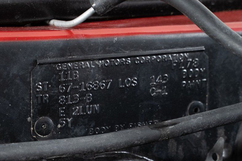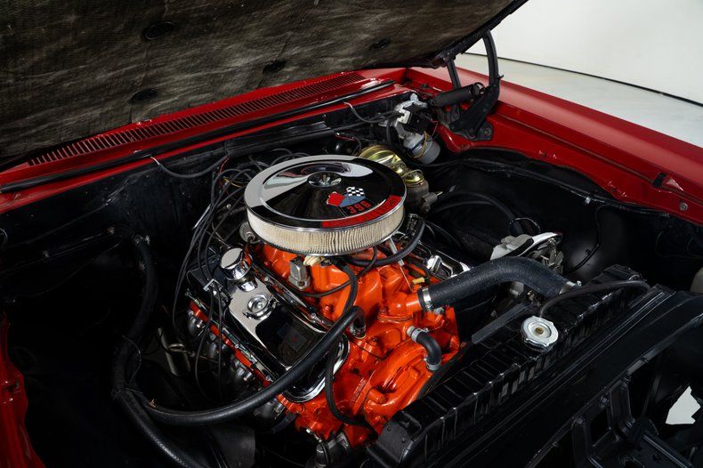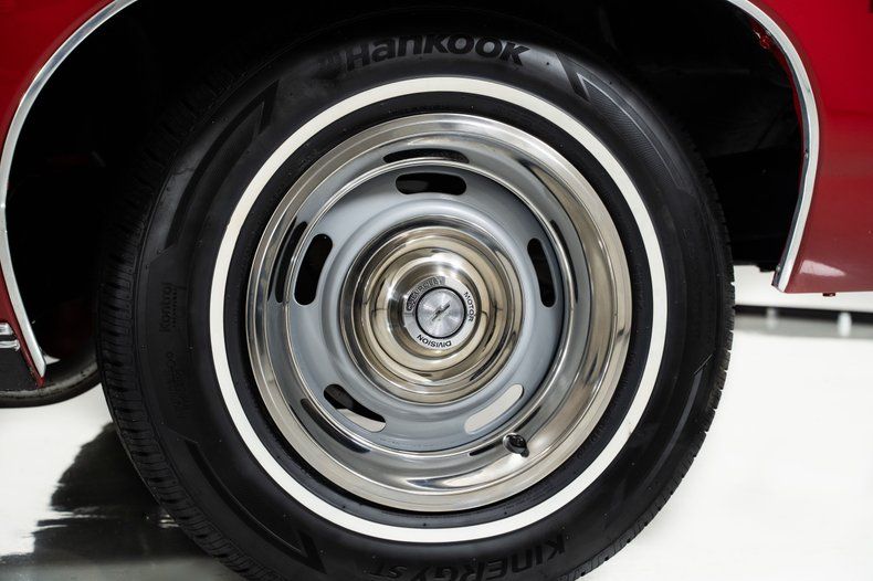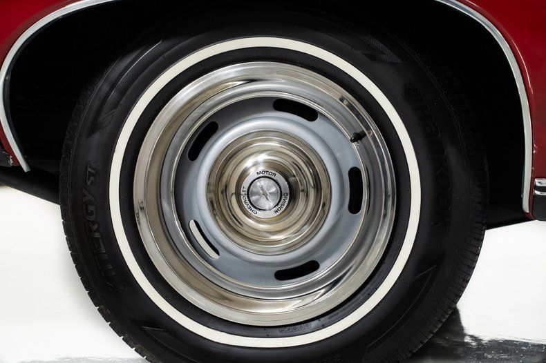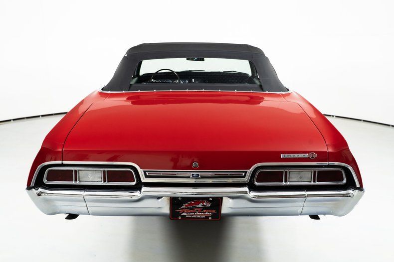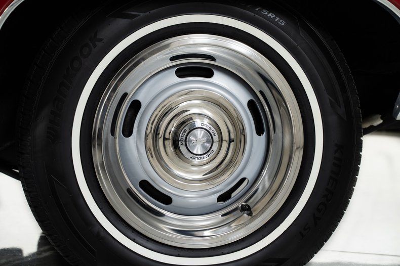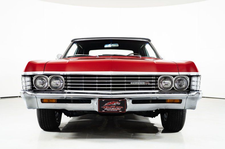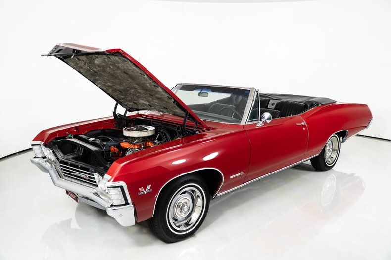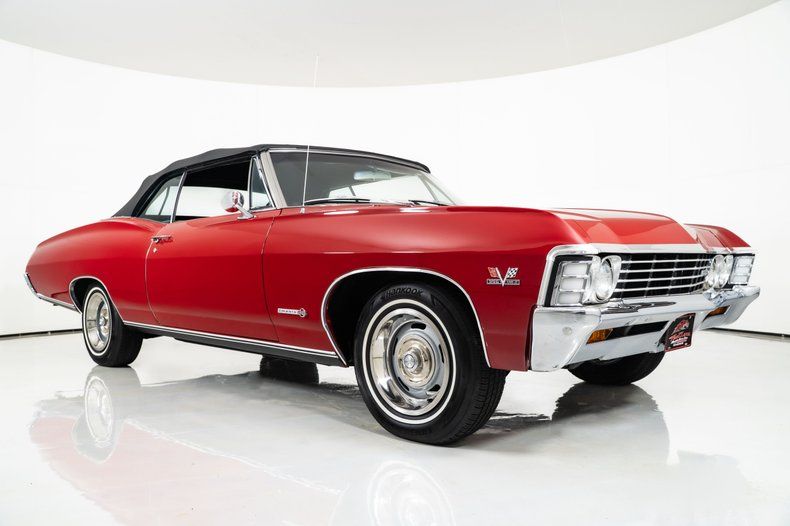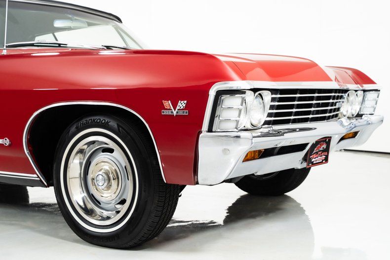 Finished in red with a black power top, this '67 Chevy Impala has the bold, unmistakable look that defined Chevrolet's full-size performance cars of the late 1960s. It rides on 15-inch Rally wheels, wrapped front and rear in radial white-wall tires measuring 215/75R15, giving this '67 Impala the proper stance and period-correct style.