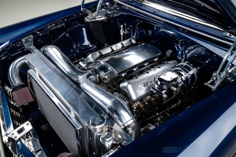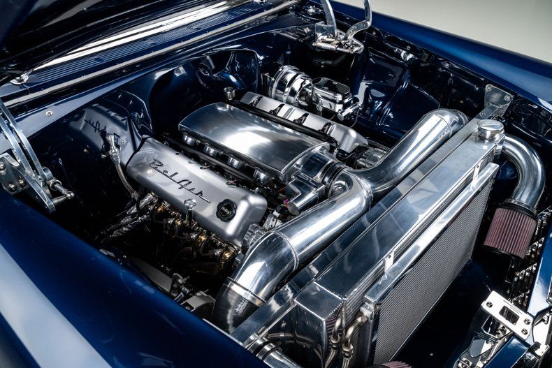 Finished in an attractive metallic blue over metallic silver two-tone, the body presents a tasteful interpretation of Chevrolet's iconic Bel Air styling. Traditional trim, chrome and badging remain intact, preserving the unmistakable character that defines the model, while subtle modern touches enhance the presentation. LED '56-style tail lamps provide improved visibility without altering the factory look, and the car's athletic stance immediately signals its modern underpinnings. Completing the exterior are 18" Forgeline CH3P wheels finished in gunmetal with polished lips, wrapped in BFGoodrich G-Force tires that fill the arches perfectly and complement the car's lowered posture.