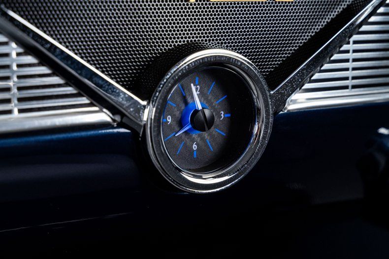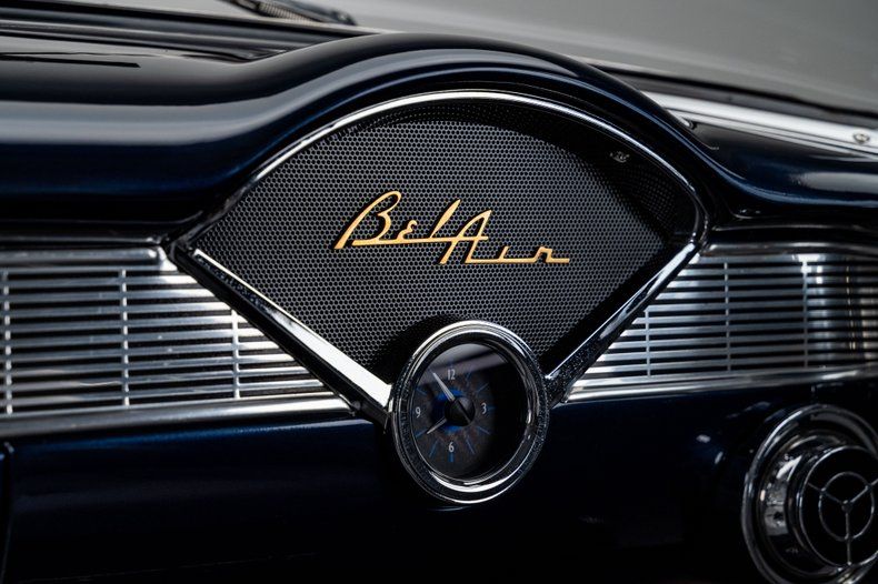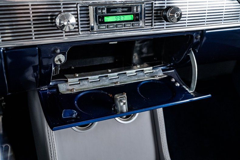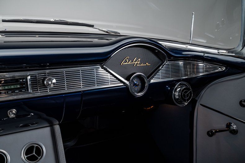 Inside, the Bel Air retains its classic dashboard design while incorporating modern comfort and functionality. Custom leather bucket seats trimmed in light grey provide a comfortable and supportive driving environment, contrasted by dark blue carpet and a body-matched dash that continues the elegant two-tone theme. The classic Bel Air dash presentation remains intact but now houses Dakota Digital gauges and a Custom Autosound AM/FM/Aux head unit, along with controls for modern air conditioning. A custom full-length center console adds convenient storage and integrated cupholders, while a classic Bel Air steering wheel mounted to a tilting column completes the blend of vintage style and modern usability. The attention to detail continues in the trunk, which is fully upholstered to match the interior for a clean, finished presentation.