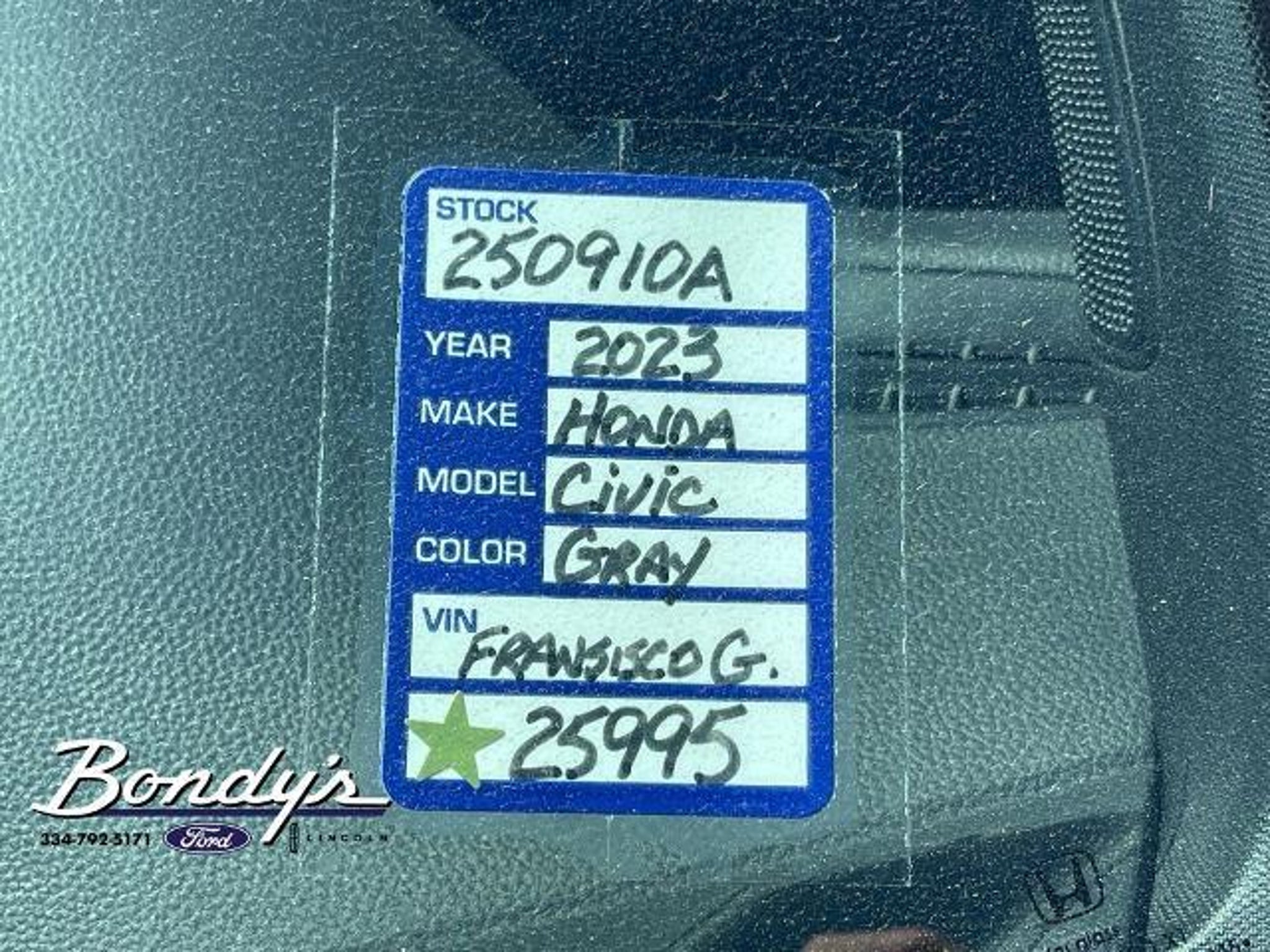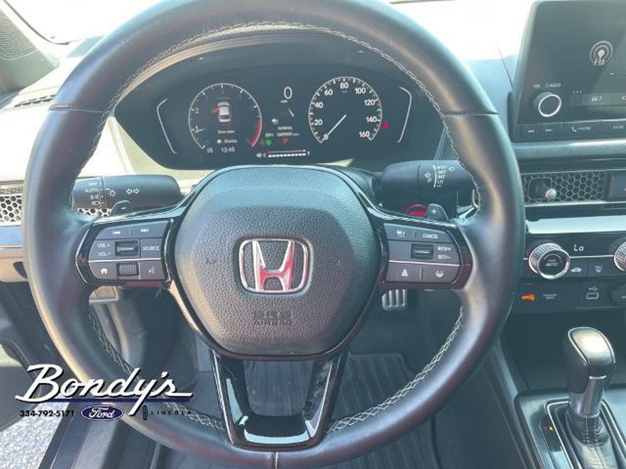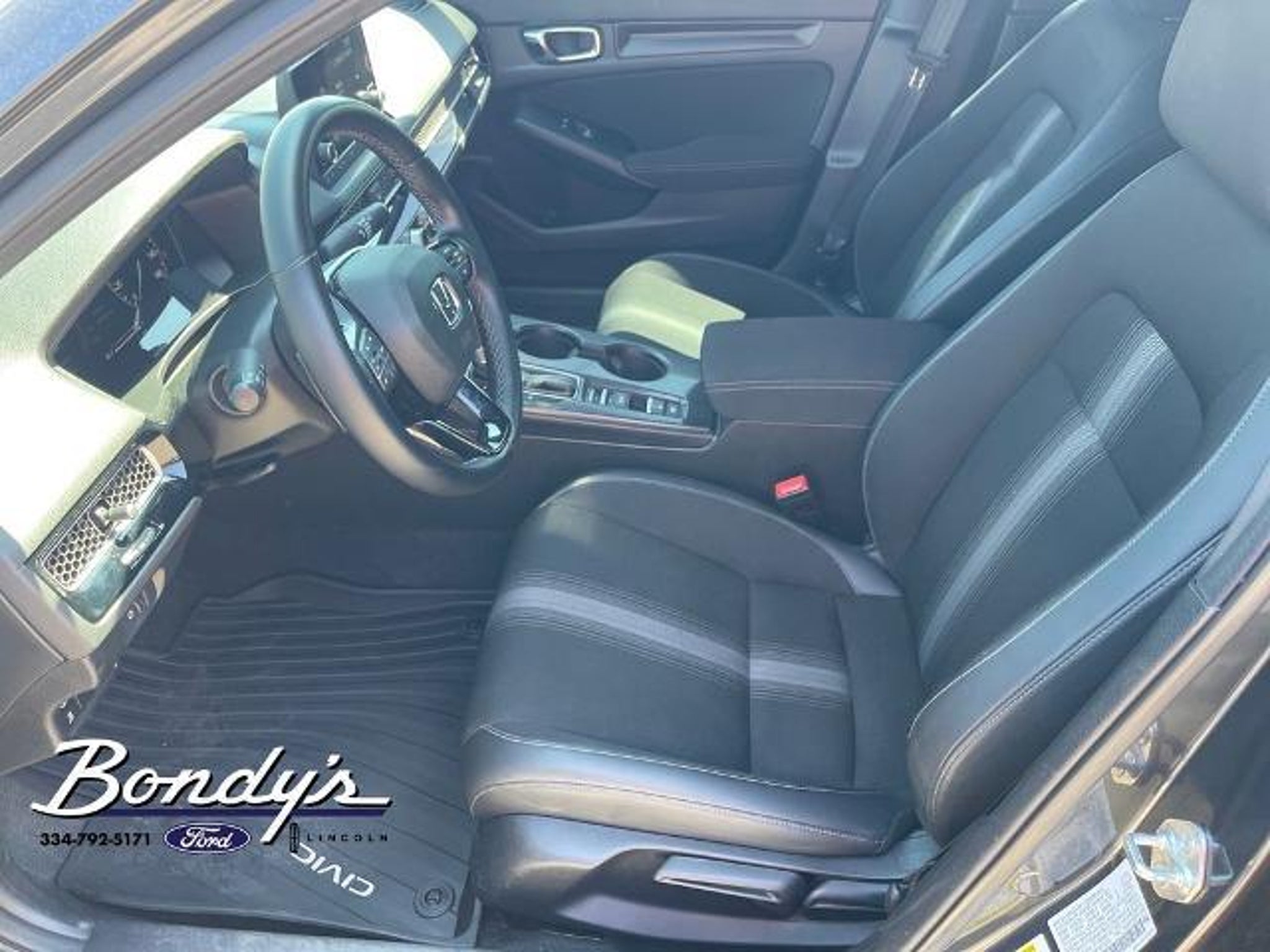 CARFAX One-Owner. 2023 Honda Civic Sport Cloth, 4-Wheel Disc Brakes, 8 Speakers, ABS brakes, Adaptive Cruise Control: Adaptive Cruise Control (ACC) with Low-Speed Follow, Air Conditioning, Alloy wheels, AM/FM radio, Apple CarPlay/Android Auto, Auto High-beam Headlights, Automatic temperature control, Brake assist, Bumpers: body-color, Cloth Seat Trim, Delay-off headlights, Driver door bin, Driver vanity mirror, Dual front impact airbags, Dual front side impact airbags, Electronic Stability Control, Emergency communication system: HondaLink, Exterior Parking Camera Rear, Four wheel independent suspension, Front anti-roll bar, Front Bucket Seats, Front Center Armrest, Front reading lights, Fully automatic headlights, Illuminated entry, Knee airbag, Leather Shift Knob, Leather steering wheel, Low tire pressure warning, Occupant sensing airbag, Outside temperature display, Overhead airbag, Panic alarm, Passenger door bin, Passenger vanity mirror, Power door mirrors, Power steering, Power windows, Radio data system, Radio: 180-Watt Audio System w/8 Speakers, Rear anti-roll bar, Rear side impact airbag, Rear window defroster, Remote keyless entry, Security system, Speed control, Speed-sensing steering, Steering wheel mounted audio controls, Tachometer, Telescoping steering wheel, Tilt steering wheel, Traction control, Trip computer, Wheels: 18 Gloss Black Alloy, Cloth. FWD 2.0L I4 DOHC 16V i-VTEC CVT THIS VEHICLE IS LOCATED AT BONDY'S FORD LINCOLN AT 3615 ROSS CLARK CIRCLE DOTHAN, AL 36303. PLEASE CALL US AT 800-239-5171 TO ASK US ANY QUESTIONS! MON-FRI SALES IS HERE FROM 8:30 TO 7:00 AND SAT 8:30 TO 6:00. WE ARE CLOSED ON SUNDAYS. Call Toll Free 800-239-5171 or 334-792-5171.