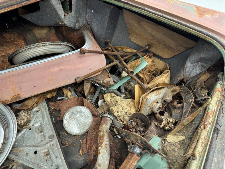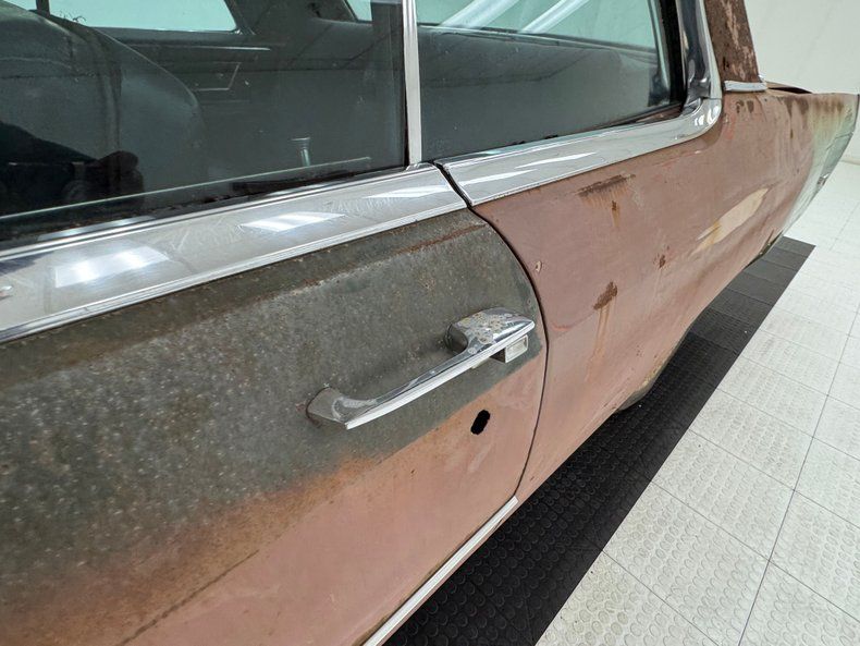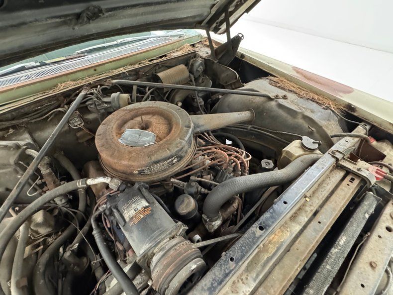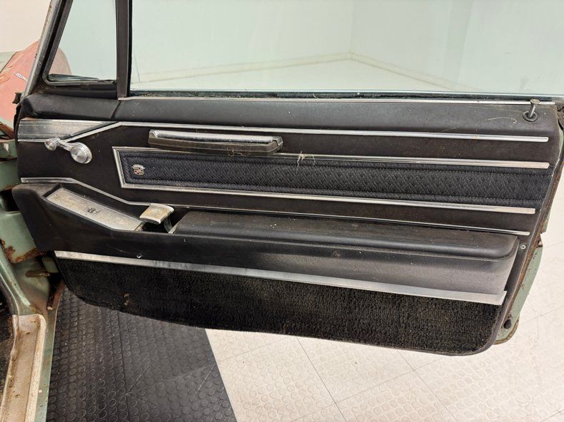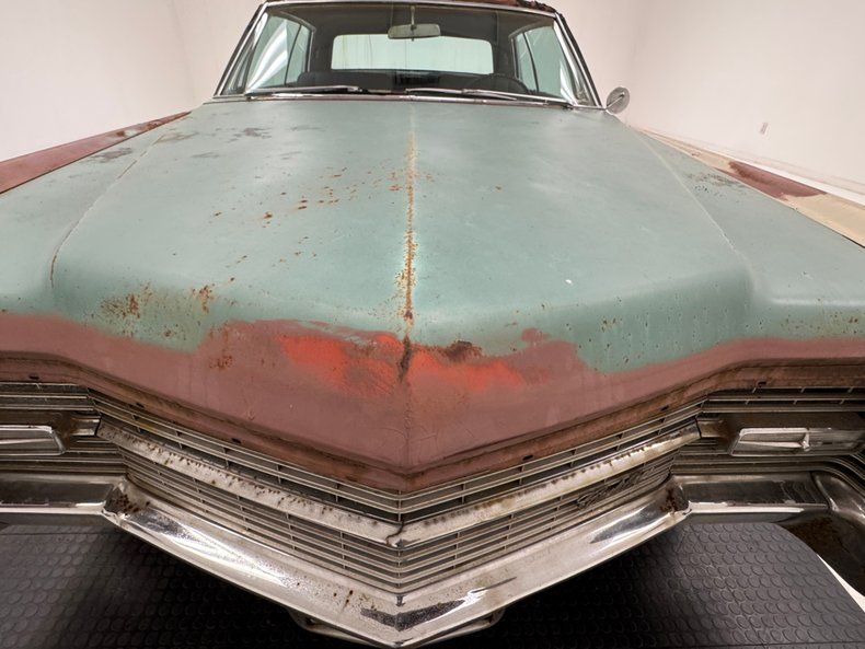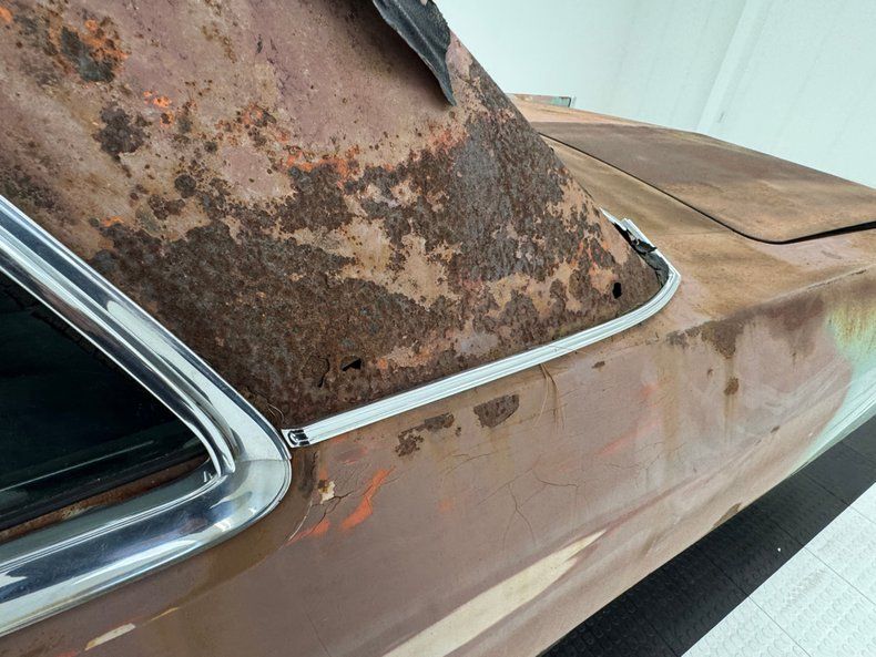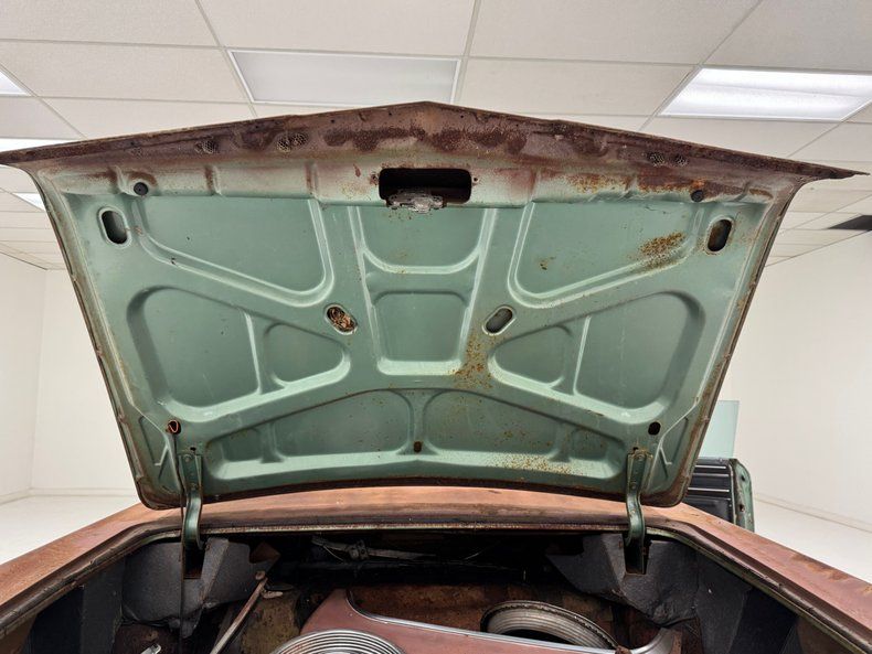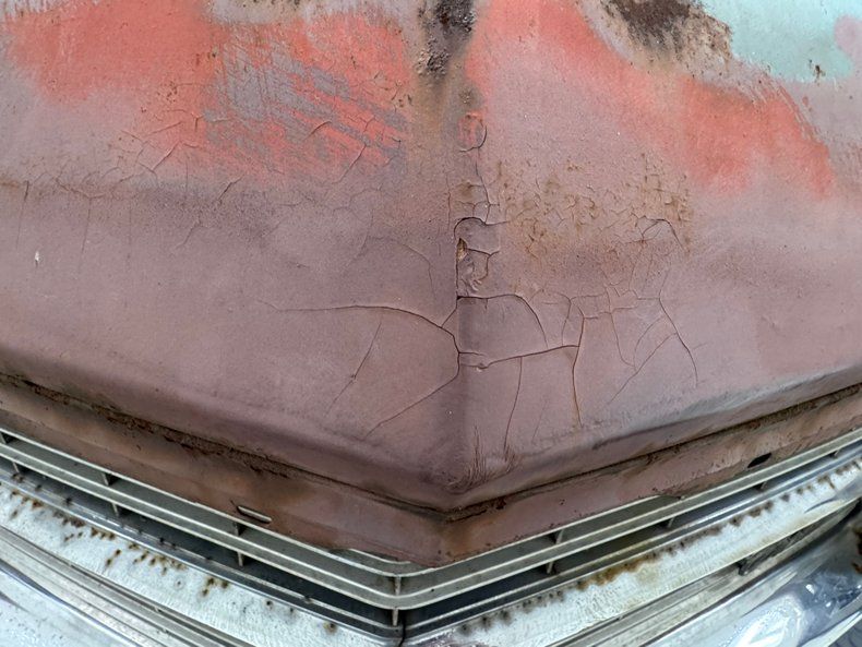 Every panel of stamped steel on this car is about a football field in length, representing a time when Detroit owned the streets and roamed America like dinosaurs. There are remnants of glory here; the vertical tail light nacelles in chrome, pointed at both ends and taking in a two part lens that mirrors itself. Stacked headlights serve as bookends for the eggcrate grille, split for 1966, and embedded with crosshair covered turn signals. The black vinyl top is long gone, but you can picture it with the Cascade Green paint this car was born with and appreciate the combo. The body is full of patina; faded paint, surface rust, dents and dings, missing trim, cracking body filler, and yes, significant rust through.
