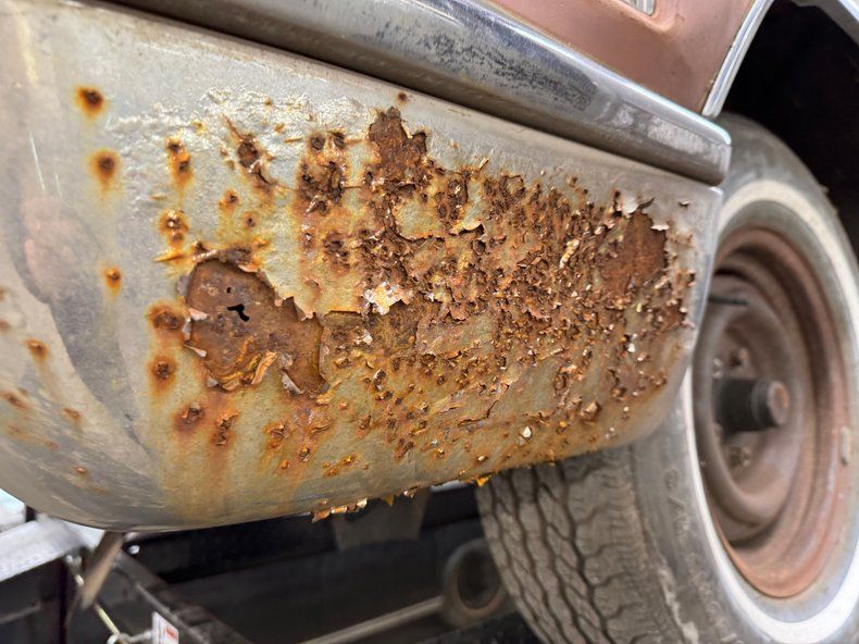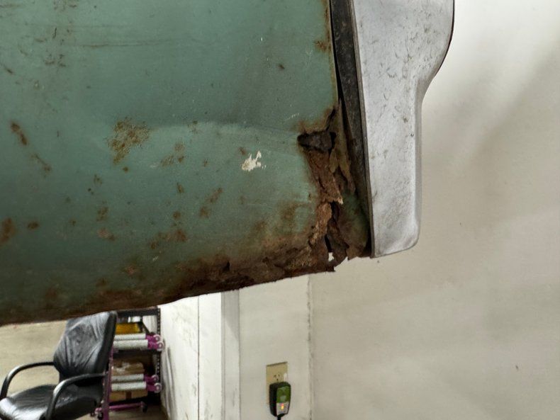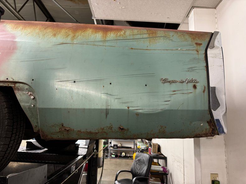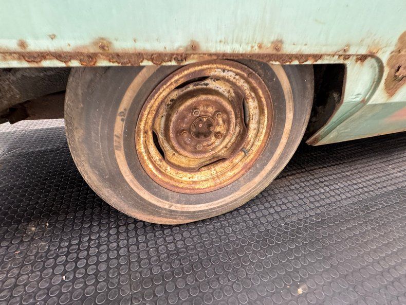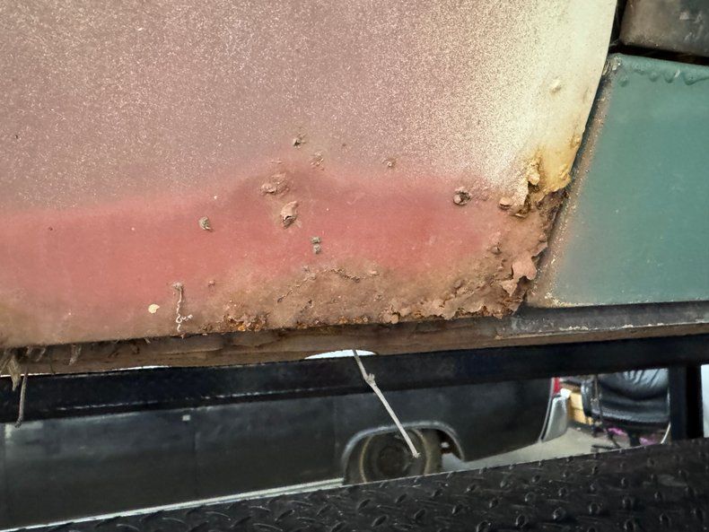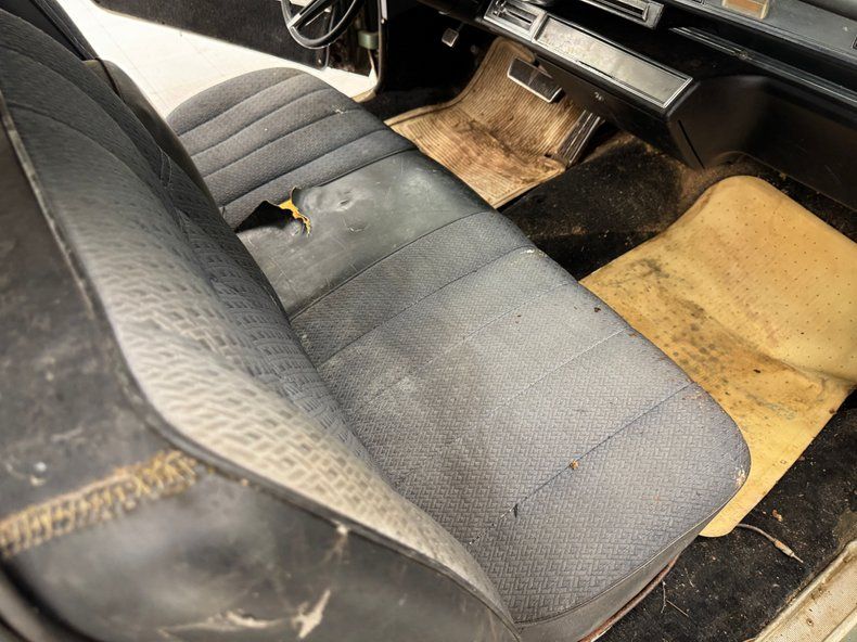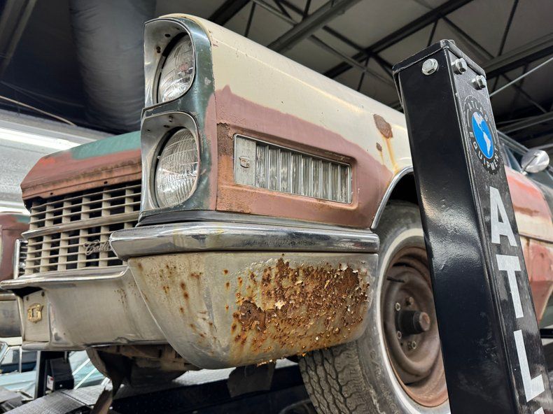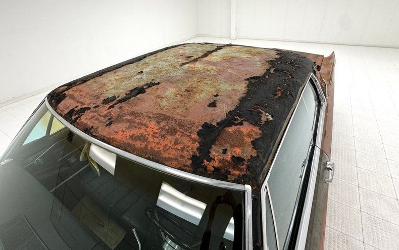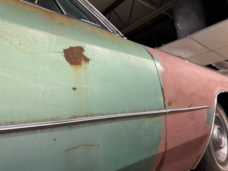 Every panel of stamped steel on this car is about a football field in length, representing a time when Detroit owned the streets and roamed America like dinosaurs. There are remnants of glory here; the vertical tail light nacelles in chrome, pointed at both ends and taking in a two part lens that mirrors itself. Stacked headlights serve as bookends for the eggcrate grille, split for 1966, and embedded with crosshair covered turn signals. The black vinyl top is long gone, but you can picture it with the Cascade Green paint this car was born with and appreciate the combo. The body is full of patina; faded paint, surface rust, dents and dings, missing trim, cracking body filler, and yes, significant rust through.