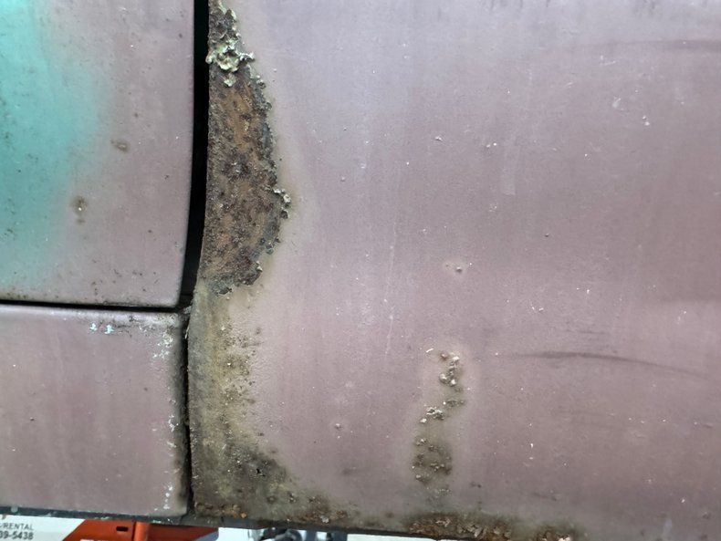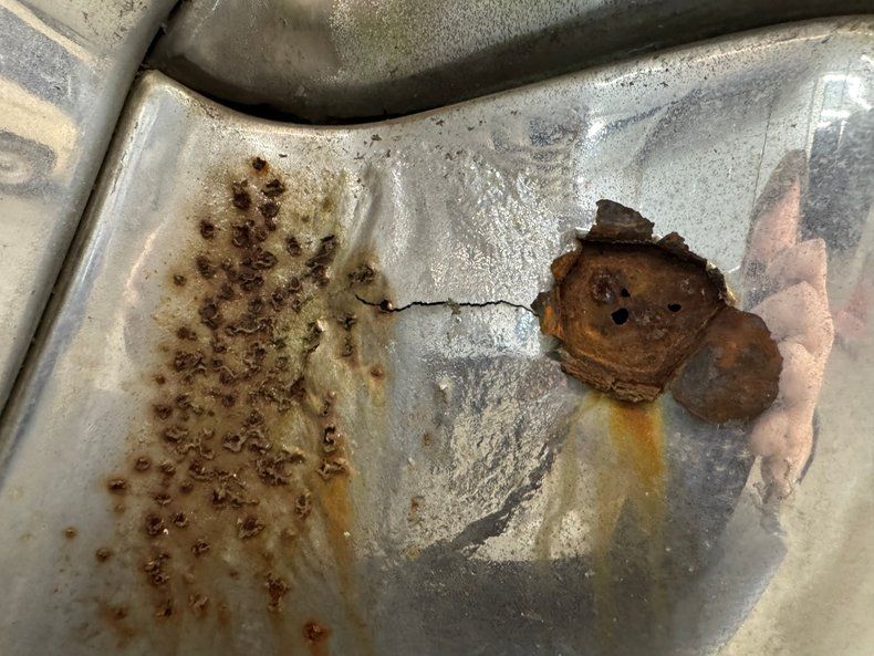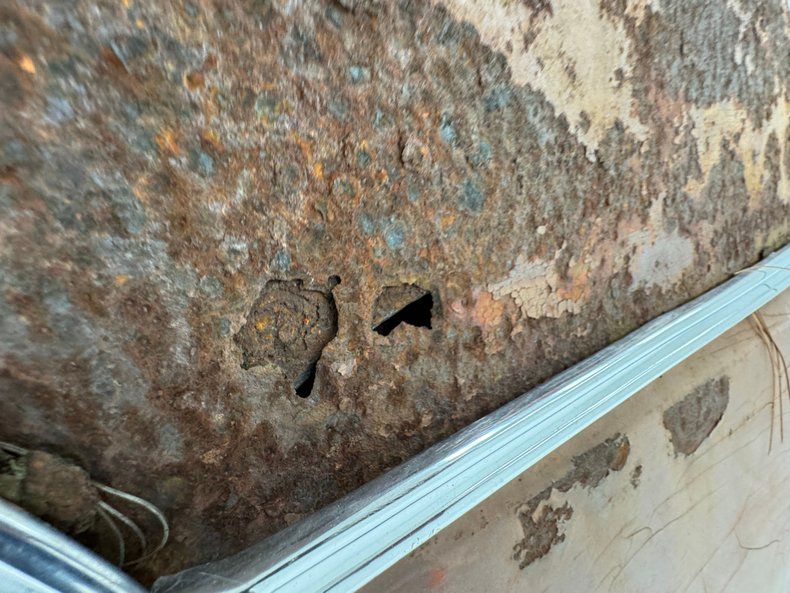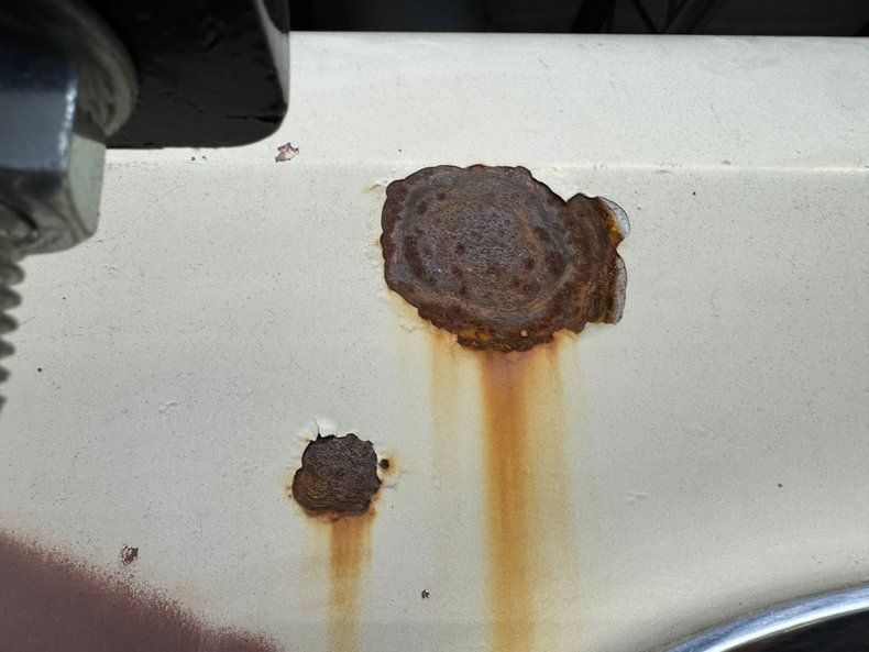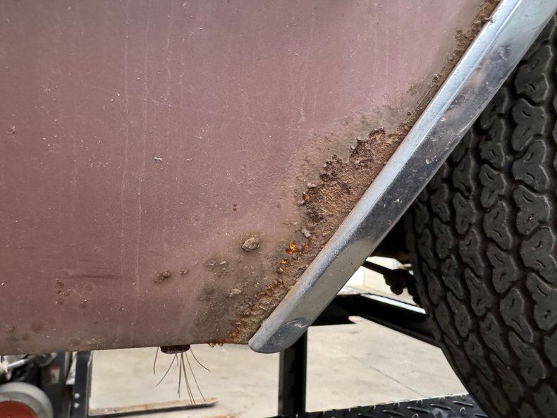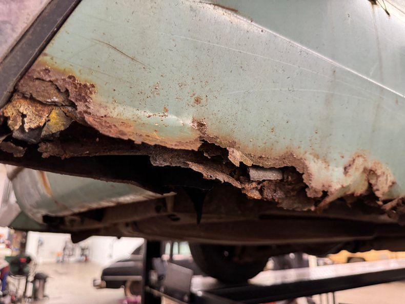 Covered in surface rust and having a few rust holes through thin metal, the underside presents a bit better than we'd expect and appears relatively solid. Power drum brakes were supplied to all four wheels and a single exhaust wears a stock style muffler. Coil springs suspend the car front and back with a 4 link adding to the factory rear system.