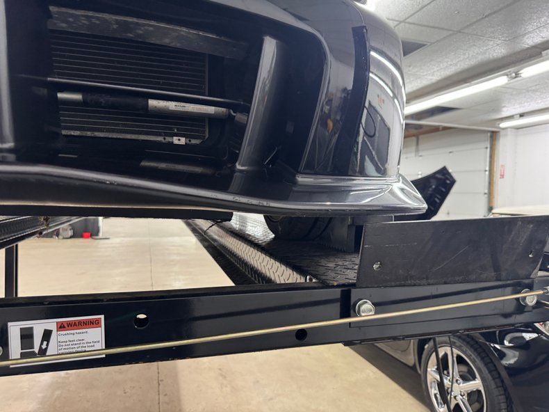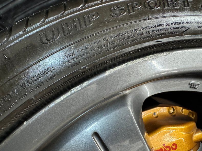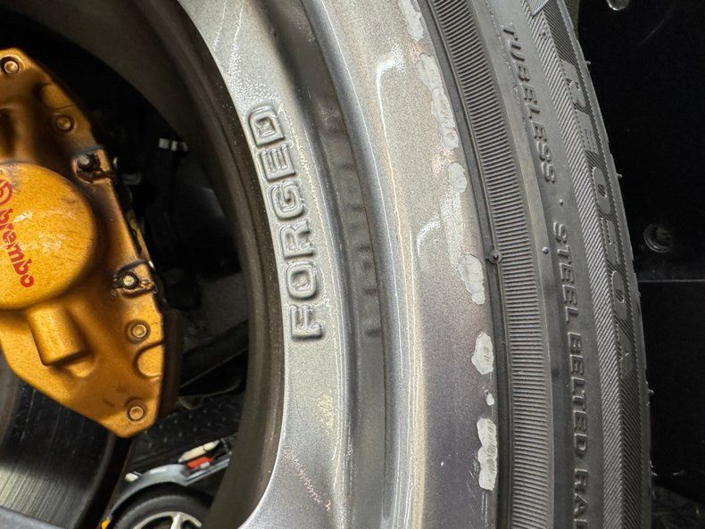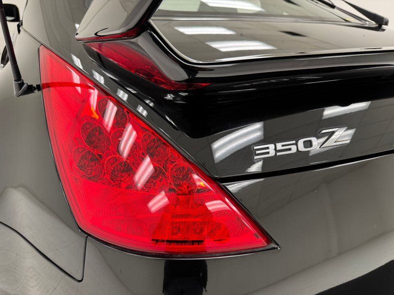 Reminiscent of an F-117 Nighthawk fighter jet, Magnetic Black Pearl covers this streamlined Japanese sports car which is adorned with wind tunnel proven aerodynamics. This one's not flying under the radar with that not so stealthy chin spoiler, elaborate wing, rear fascia, and others that are not just for show, they're for airflow and downforce! 18-inch wheels and their argent gray color matches the cladding, while the gold Brembo calipers add a flash of contrast. Underneath it all is the 350's classic shape with flush headlights and tail lights, raked windshield, curves everywhere, and the characteristic vertical door handles. Imperfections include several chips and scratches, a scuff on a rocker panel, some gap misalignment on the hood, splatter on the rear diffuser, scuffs and flex cracks on the rear bumper cover, a nasty scrape on the air dam wing, chips on the front and chin, some curb rash on several wheels.