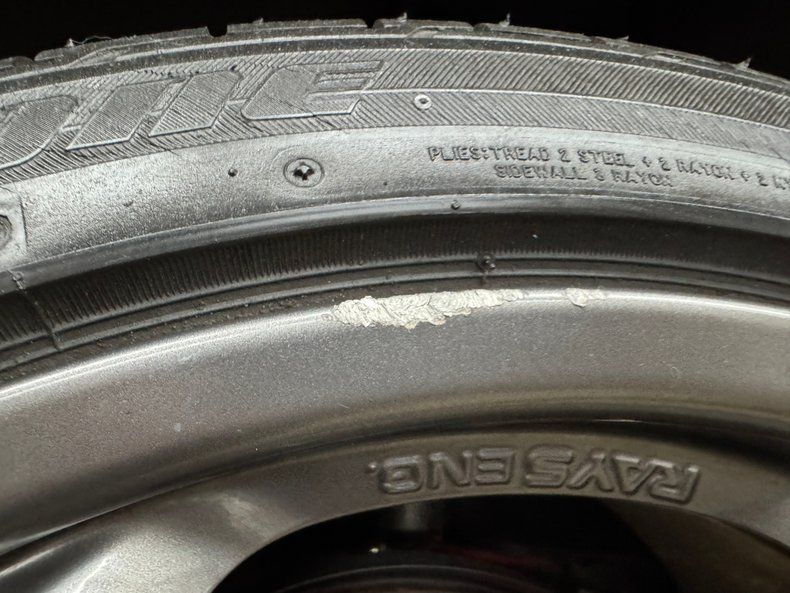 Some age induced metal oxidation and minimal surface rust is found underneath in an otherwise clean and dry environment. The Nismo tuned exhaust converges as one, then enters an original muffler, splitting again to exit via tree trunk sized exhaust tips. Brembo power disc brakes are at all four corners and multi-link independent suspension is at the front and the back and makes up the Nismo tuned suspension. While here, we note some severe dry rot on a rear tire's sidewall.