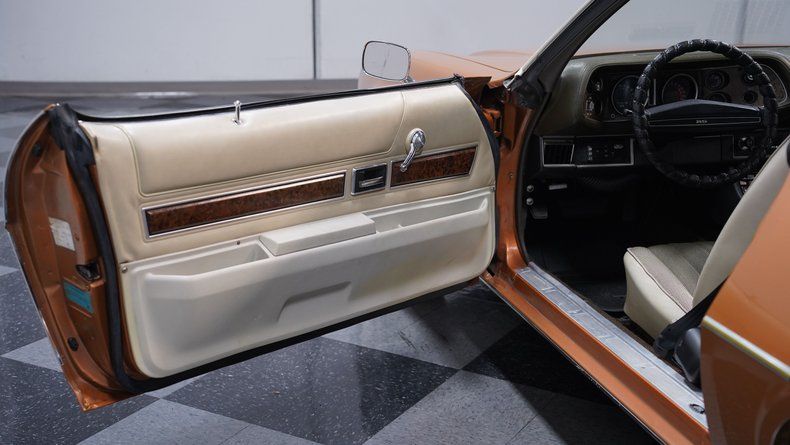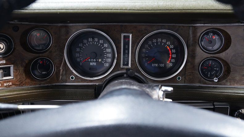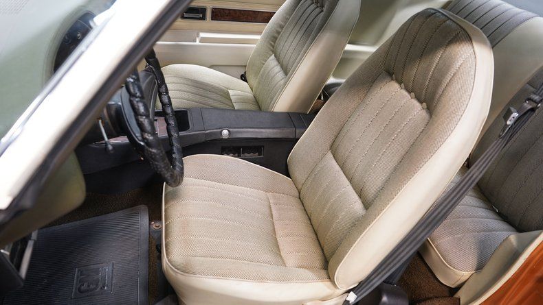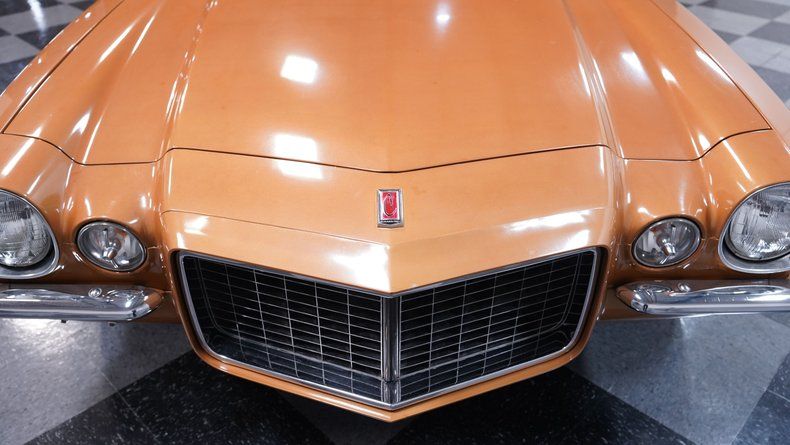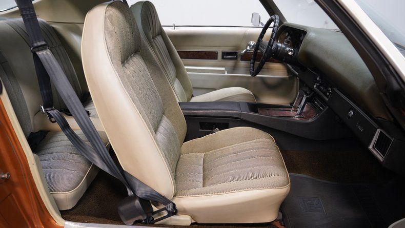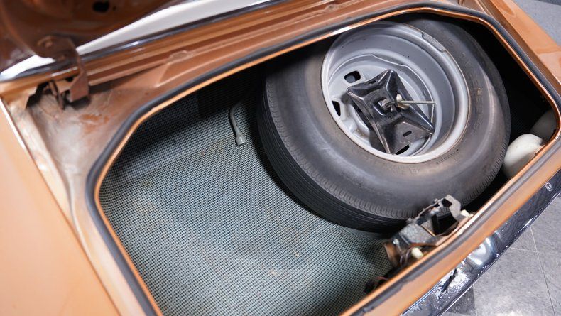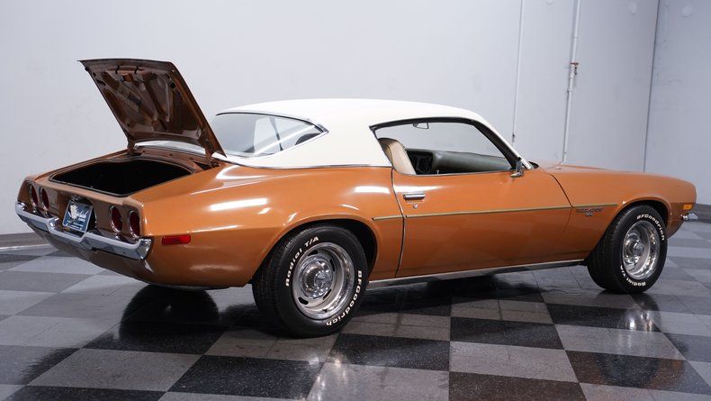 The Mohave Gold paint is more of a distinctive color shade from the early '70s era, which helps this 1972 Chevrolet Camaro RS Tribute stand out from the crowd of more commonly seen shades from this era. The car wears an RS-style front clip with the correct horizontal parking lights, giving it the aggressive look enthusiasts love. Paired with the crisp white vinyl top, 15-inch rally wheels with center caps and beauty rings, and chrome front and rear bumpers, this Camaro carries a strong dose of classic sports car attitude. The headlights, taillights, trim, and moldings all appear correct, and the glass around the car shows no signs of major damage.