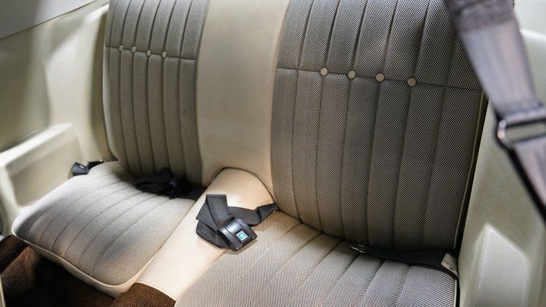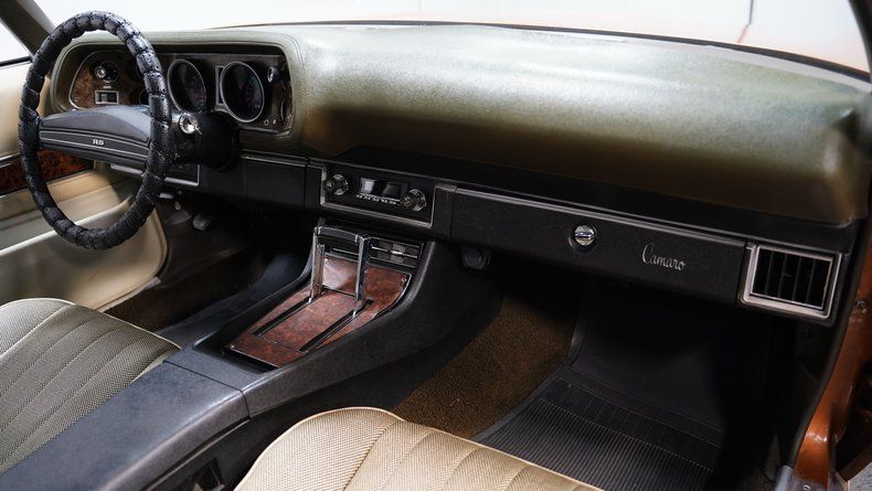 Inside, the Camaro presents well with Covert/Cream vinyl and cloth seating that looks clean and inviting. The matching door panels are in good condition and complement the rest of the cabin nicely. A center console with the iconic horseshoe-grip shifter blends into the darker gray lower dash, while the upper dash contrasts with a warm brown finish typical of the era. A stock-appearing leather-wrapped steering wheel sits ahead of a clean factory-style gauge cluster with gauges that are clear and easy to read. Providing the tunes is an aftermarket RetroSound® radio, giving you modern convenience while maintaining a vintage appearance. The veneer inserts add a nice touch of class, the carpet and headliner are clean, the weather stripping looks good, and the trunk is tidy with a spare tire in place.