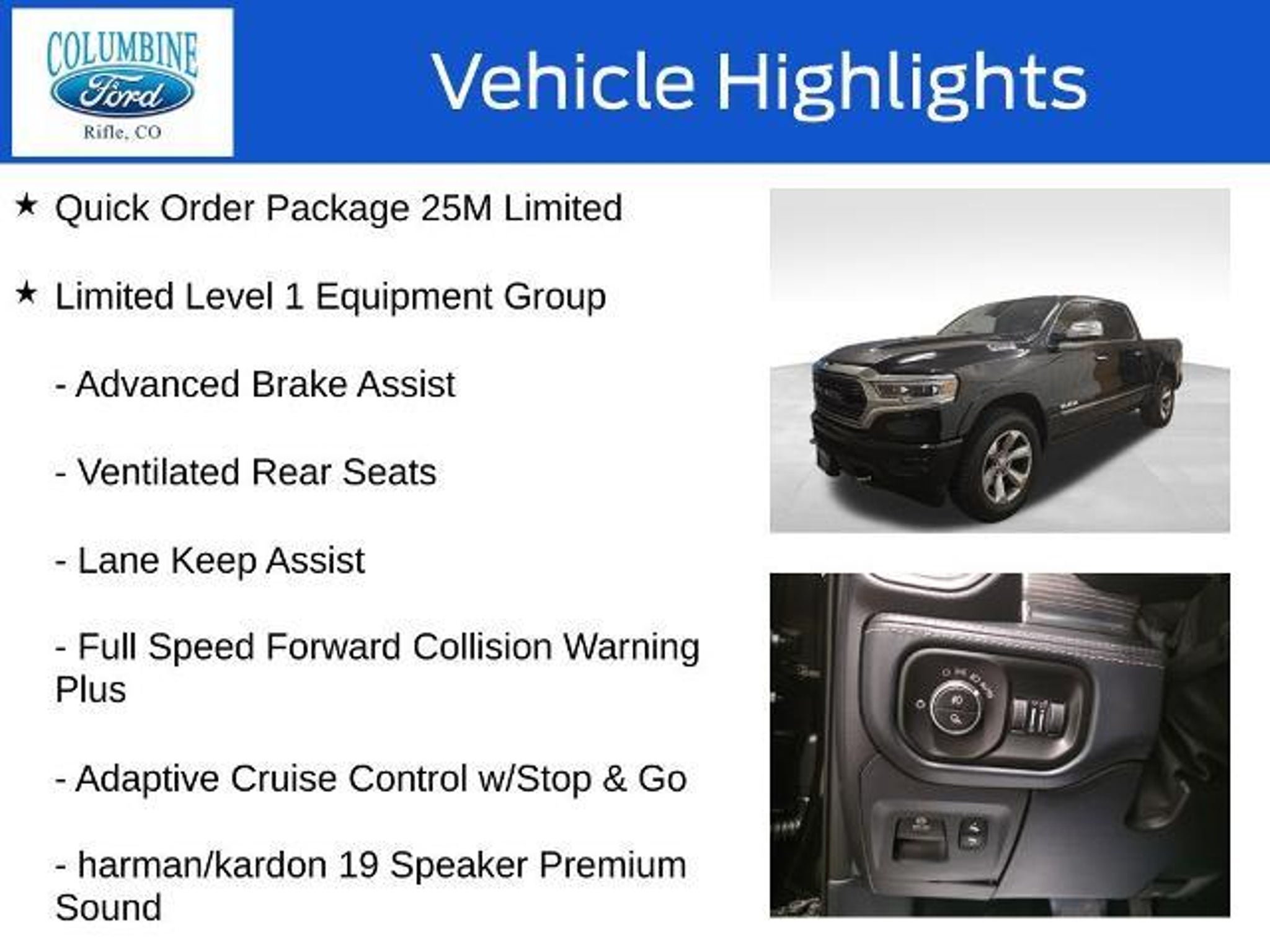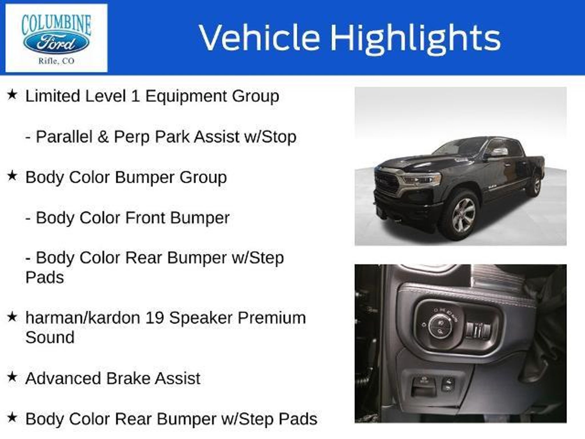 Commanding the road with unparalleled power and sophistication, this 2019 Ram 1500 Limited is a true masterpiece of automotive engineering. Boasting a HEMI 5.7L V8 engine, this truck delivers an exhilarating driving experience, seamlessly blending raw power with exceptional efficiency. - Harman/Kardon 19 Speaker Premium Sound System - Adaptive Cruise Control with Stop & Go - Advanced Brake Assist - Parallel & Perpendicular Park Assist with Stop - Ventilated Rear Seats - Full Speed Forward Collision Warning Plus - Lane Keep Assist Elevating the driving experience, the Limited Level 1 Equipment Group offers a suite of advanced technologies and luxurious amenities. Indulge in the captivating 12-inch touchscreen display, immerse yourself in the crystal-clear Harman/Kardon audio system, and enjoy the convenience of the Uconnect infotainment system with integrated navigation. Designed to impress, the exterior of this Ram 1500 Limited exudes a commanding presence. The striking Diamond Black Crystal Pearlcoat paint and body-color bumpers create a bold, sophisticated look that is sure to turn heads. The dual-pane panoramic sunroof floods the cabin with natural light, enhancing the sense of spaciousness and elevating the overall driving experience. Comfort and convenience are at the forefront of this exceptional vehicle. The heated and ventilated front seats, heated steering wheel, and dual-zone automatic climate control ensure you and your passengers enjoy a tailored, luxurious journey. The anti-spin differential rear axle and trailer brake control further enhance the truck's capabilities, making it the perfect companion for your towing and off-road adventures. With a 33-gallon fuel tank and an impressive fuel efficiency of 15 city/21 highway MPG, this Ram 1500 Limited offers the perfect balance of power and efficiency to tackle any task with confidence. At Columbine Ford, we're proud to be Western Colorado's most trusted dealership and a multi-year recipient of Ford's prestigious President's Award for exceptional customer satisfaction. Our team is committed to honesty, transparency, and delivering a hassle-free buying experience on every visit. Whether you're shopping new or pre-owned, you'll find unbeatable service, western Colorado's largest selection of vehicles, competitive pricing, and a dealership that truly cares. Visit us at 2828 Railroad Ave., Rifle, CO 81650 or call 970-625-1680. Experience the award-winning difference at Columbine Ford?where Colorado comes to drive.