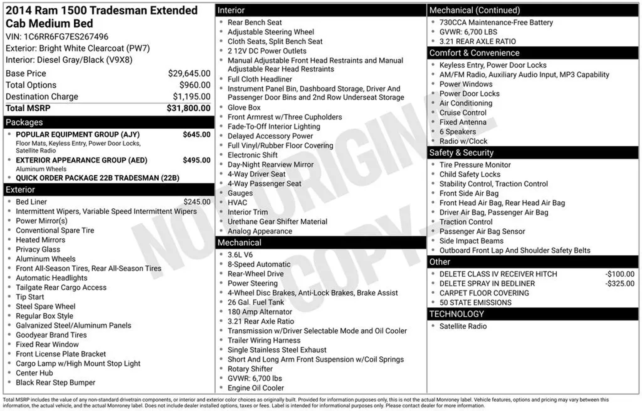 THIS VEHICLE IS SOLD 'AS IS' WITHOUT ANY WARRANTY OR GUARANTEE, EXPRESS OR IMPLIED, INCLUDING ANY WARRANTY OF MERCHANTABILITY OR FITNESS FOR A PARTICULAR PURPOSE. THE BUYER ASSUMES ALL RESPONSIBILITY AND RISK FOR ANY AND ALL REPAIRS OR MAINTENANCE NEEDED AFTER THE SALE. CLEAN CARFAX, SIRIUS XM SATELLITE RADIO, DROP-IN BEDLINER, TOW PACKAGE / TRAILER PACKAGE, TRADESMAN SERIES, EXTERIOR APPEARANCE PACKAGE, POPULAR EQUIPMENT PACKAGE, QUICK ORDER PACKAGE 22B TRADESMAN, 17 ALUMINUM WHEELS, 3.21 REAR AXLE RATIO, 6 SPEAKERS, AIR CONDITIONING, BRAKE ASSIST, BRIGHT FRONT BUMPER, BRIGHT GRILLE, BRIGHT REAR BUMPER, DELAY-OFF HEADLIGHTS, FRONT CENTER ARMREST, HEATED DOOR MIRRORS, LOW TIRE PRESSURE WARNING, OCCUPANT SENSING AIRBAG, POWER DOOR MIRRORS, POWER STEERING, POWER WINDOWS, REAR FOLDING SEAT, REAR STEP BUMPER, REMOTE KEYLESS ENTRY W/ALL-SECURE, SPEED CONTROL, TILT STEERING WHEEL, TIP START, VARIABLY INTERMITTENT WIPERS.