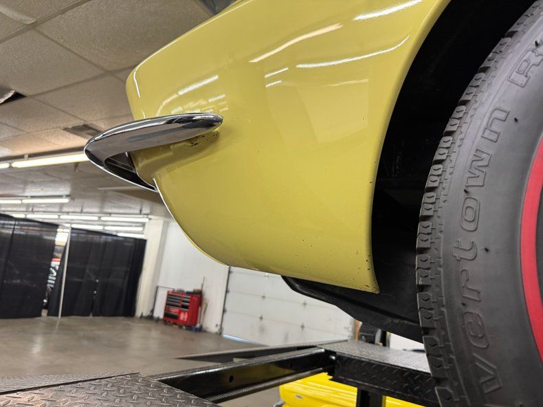If you said this is the most beautiful American car ever designed, you'd have a solid case. The lines molded into the fiberglass simply all work together is a sinuous flow of bulges and curves, and the coverage of two stage Sunfire Yellow paint is fantastic. Raised fenders flow back to a shoulder line that leads to a long, flat decklid. Side pipes and their vented covers provide the sleek sports car with a muscular attitude and the 15-inch turbine style wheels are the perfect fit, here with redline tires. The central power bulge on the hood is iconic, maybe even more than the fender gills that are fitting and spectacular. An accessory hardtop provides a matching C-pillar and curved rear window while the white canvas top provides the ability for a quick change subject to the weather. Imperfections include cracking paint on the hood, some wear on the stitched edge of the soft top, a hole in that top, some checking of the paint on the decklid, touched up chips on the tonneau as well as those in need of touch up, uneven paint on a gill, rock chips, cracking bodywork under the bumper in back, and crazing on a fender.