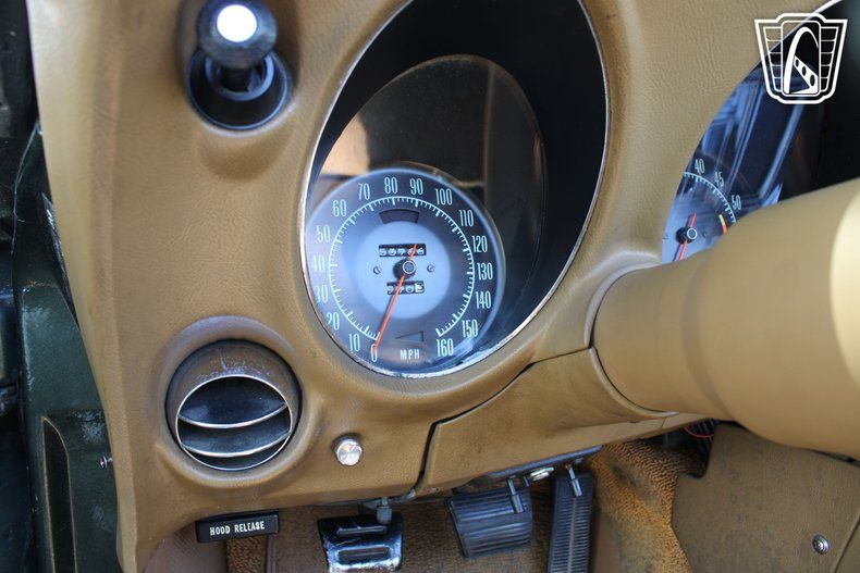 Slide into the driver's seat and feel the embrace of the tan interior, a timeless pairing with the bold green exterior. Your hands naturally find their place on the steering wheel, and as you glance over the dash, the classic styling of the gauges and controls takes you back to an era when driving was all about connection and passion. With the 4-speed manual transmission at your fingertips, you're in complete control, ready to unleash the power of the 350 cubic inch V8 engine under the hood.