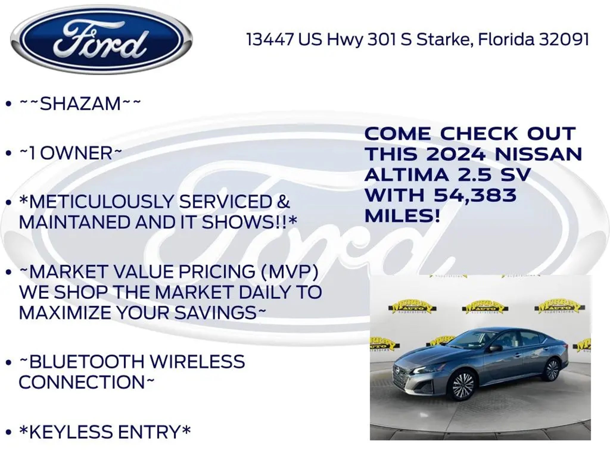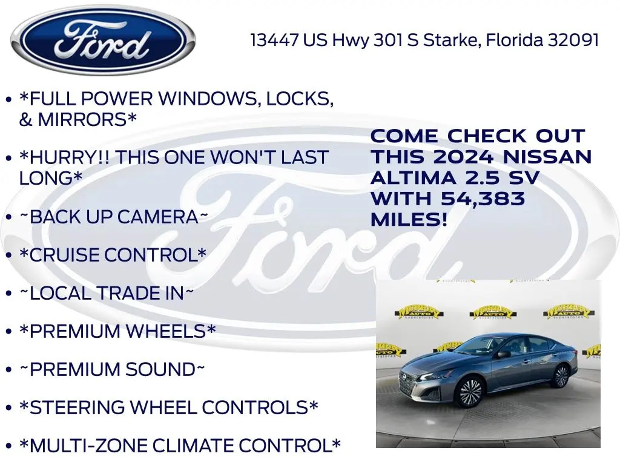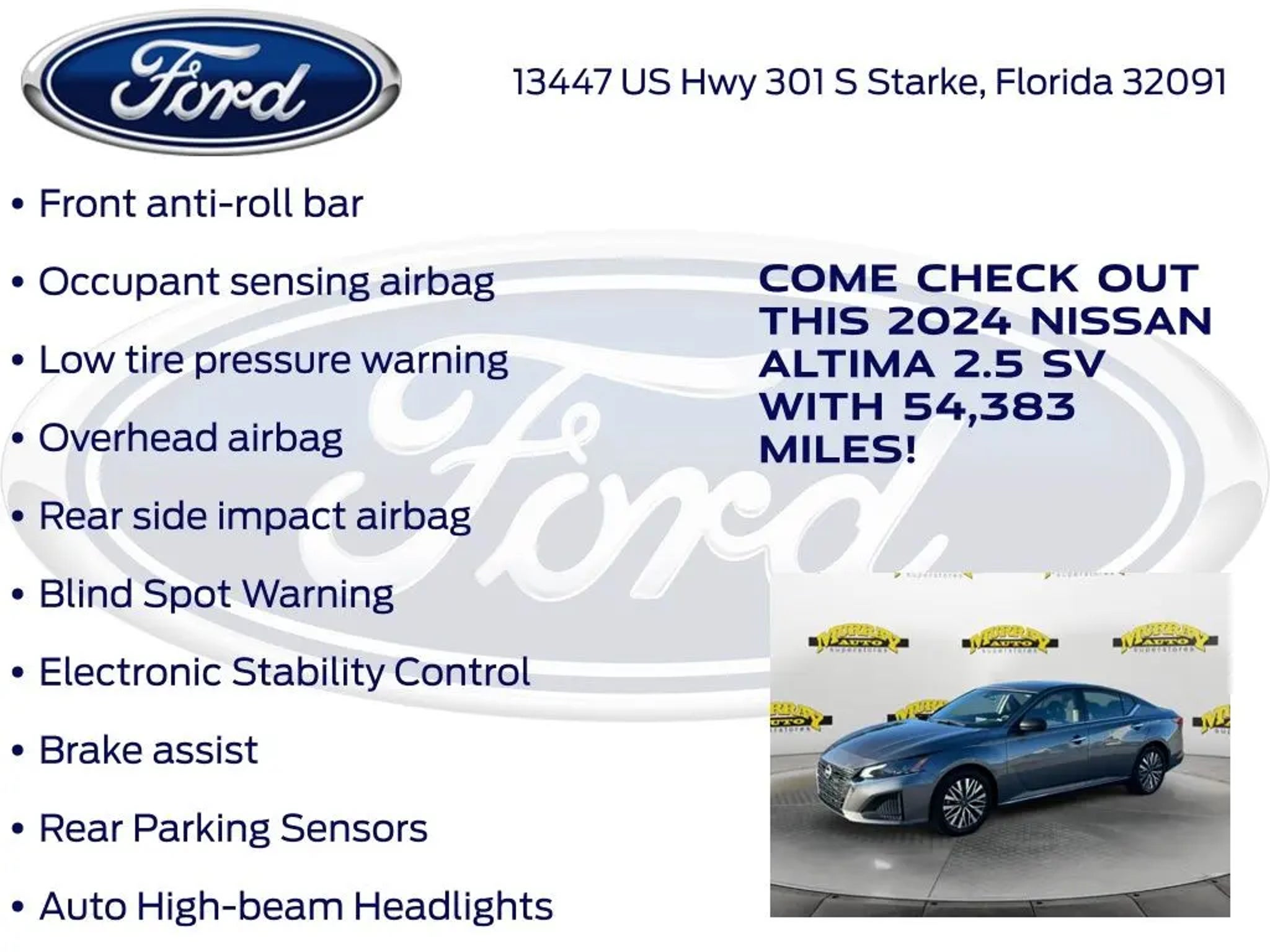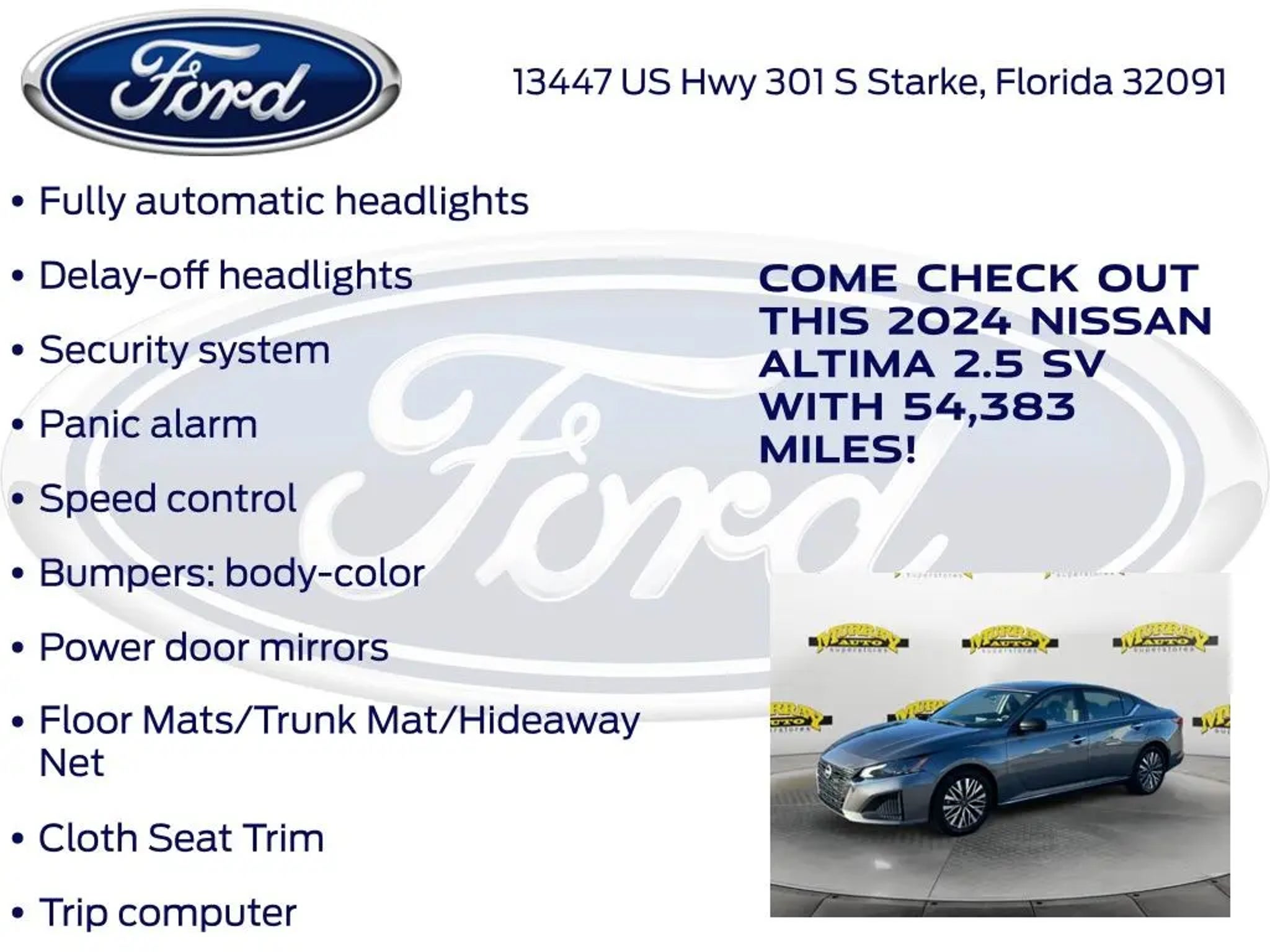 CARFAX One-Owner. Priced below KBB Fair Purchase Price! Odometer is 2111 miles below market average! Murray Ford Superstore of Starke is excited to offer this fantastic-looking 2024 Nissan Altima in Gun Metallic This vehicle is readily available and comes with the following CVT with Xtronic, 17 Alloy Wheels, 4-Wheel Disc Brakes, 6 Speakers, ABS brakes, Air Conditioning, Alloy wheels, AM/FM radio: SiriusXM, Auto High-beam Headlights, Blind Spot Warning, Brake assist, Bumpers: body-color, Cloth Seat Trim, Delay-off headlights, Driver door bin, Driver vanity mirror, Dual front impact airbags, Dual front side impact airbags, Electronic Stability Control, Floor Mats/Trunk Mat/Hideaway Net, Four wheel independent suspension, Front anti-roll bar, Front Bucket Seats, Front Center Armrest, Front reading lights, Fully automatic headlights, Illuminated entry, Knee airbag, Low tire pressure warning, NissanConnect featuring Apple CarPlay, Occupant sensing airbag, Outside temperature display, Overhead airbag, Overhead console, Panic alarm, Passenger door bin, Passenger vanity mirror, Power door mirrors, Power driver seat, Power steering, Power windows, Radio data system, Radio: AM/FM Audio System, Rear anti-roll bar, Rear Parking Sensors, Rear reading lights, Rear seat center armrest, Rear side impact airbag, Rear window defroster, Remote keyless entry, Security system, Speed control, Speed-sensing steering, Speed-Sensitive Wipers, Split folding rear seat, Steering wheel mounted audio controls, Tachometer, Telescoping steering wheel, Tilt steering wheel, Traction control, Trip computer, and Variably intermittent wipers; 15 Year 150,000 mile warranty at no cost applies to all vehicles excluding Transit Vans, DRW Trucks, any SVT Models, or similar vehicles. See sales for details! All vehicles will have a $999.00 dealer fee added to the total sale price (excludes A,Z,D, and X plan customers). Taxes, tag, title fees and a $125 Electronic filling fee will be added to all vehicles in accordance with state laws of customers registering address. *** We make every effort to provide you with the most accurate, up-to-the-minute information, however it is your responsibility to verify with the Dealer that all details listed and installed options are accurate for this specific vehicle. To ensure accuracy, please contact the dealership to verify the exact options, features and programs that are included and are available for this specific vehicle prior to purchase. Price Does not Include any dealer installed options or accessories. *Dealer Discount includes $1000 Finance Bonus Cash and $1000 Trade-In Bonus Cash*