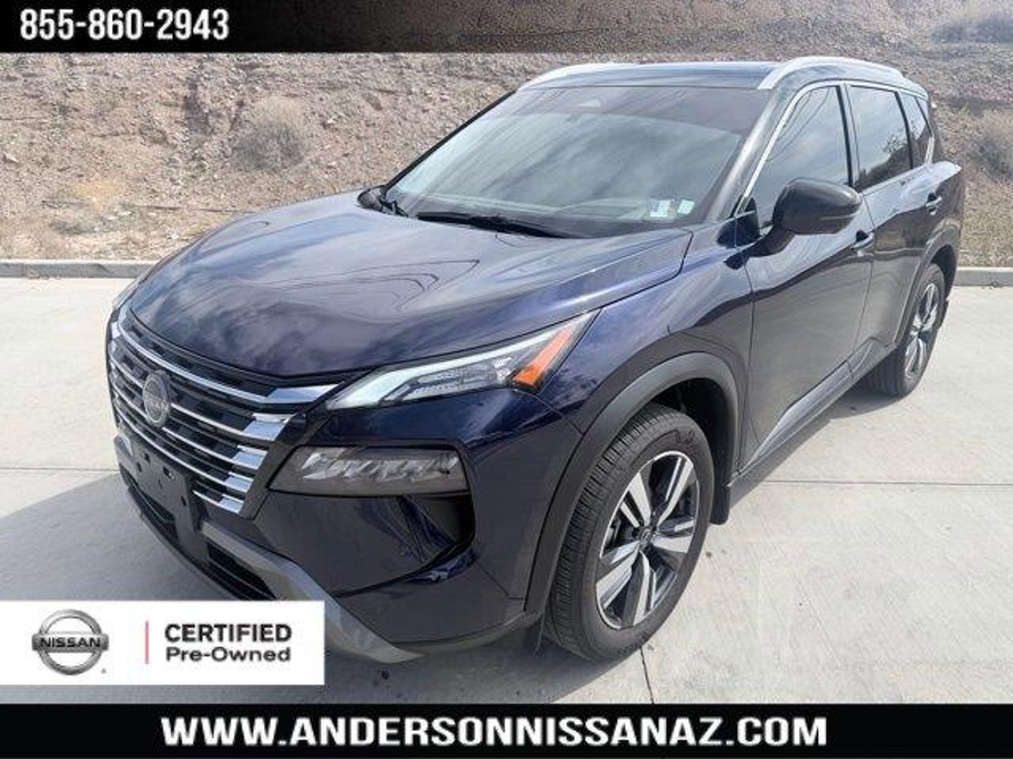 Certified. Deep Ocean Blue Pearl/Super Black 2025 Nissan Rogue SL AWD CVT with Xtronic 1.5L DOHC Nissan Certified Certified, AWD, 4-Wheel Disc Brakes, 6 Speakers, ABS brakes, Air Conditioning, Alloy wheels, AM/FM radio: SiriusXM with 360L, Android Auto and Apple CarPlay, Auto High-beam Headlights, Auto-dimming Rear-View mirror, Automatic temperature control, Brake assist, Bumpers: body-color, Chrome Rear Bumper Protector, Delay-off headlights, Driver door bin, Driver vanity mirror, Dual front impact airbags, Dual front side impact airbags, Electronic Stability Control, Emergency communication system: NissanConnect Services, First Aid Kit, Floor Mats with 2-Piece Cargo Area Protector, Four wheel independent suspension, Front anti-roll bar, Front Bucket Seats, Front Center Armrest, Front dual zone A/C, Front reading lights, Fully automatic headlights, Garage door transmitter: myQ Connected Garage, Head-Up Display, Heated door mirrors, Heated Front Bucket Seats with 8-Way Power Driver Seat and 4-Way Power Passenger Seat, Heated steering wheel, Illuminated entry, Knee airbag, Leather-Appointed Seat Trim, Low tire pressure warning, Memory Driver Seat and Outside Mirrors, Motion-Activated Power Liftgate, Navigation system: NissanConnect with Navigation and Services, Occupant sensing airbag, Outside temperature display, Overhead airbag, Overhead console, Panic alarm, Panoramic Moonroof, Passenger door bin, Passenger vanity mirror, Power door mirrors, Power driver seat, Power Liftgate, Power passenger seat, Power steering, Power windows, Radio data system, Radio: NissanConnect with Navigation and 6 Speakers, Rear anti-roll bar, Rear Door Sunshades, Rear Personal Lights, Rear seat center armrest, Rear side impact airbag, Rear window defroster, Rear window wiper, Remote keyless entry, Reverse Tilt-Down Outside Mirrors, Security system, SL Premium Package, Speed control, Speed-sensing steering, Speed-Sensitive Wipers, Split folding rear seat, Spoiler, Steering wheel mounted audio controls, Tachometer, Telescoping steering wheel, Tilt steering wheel, Traction control, Tri-Zone Automatic Temperature Control, Trip computer, Turn signal indicator mirrors, USB Charging Cable Set - Nissan, Variably intermittent wipers, Wheels: 19 Dark Painted Machine Finished Alloy, AWD. Odometer is 855 miles below market average! 28/34 City/Highway MPG Nissan Certified Details: * Warranty Deductible: $100 * Vehicle History * Roadside Assistance * 7 Year/100,000 Mile Limited Warranty, 24/7 Hour Roadside Assistance, Carfax Vehicle History Report, Plus 1 Year Pre-Paid Maintenance Included. Gas Powered Nissan Models Only. * Transferable Warranty * Limited Warranty: 84 Month/100,000 Mile (whichever occurs first) * 167 Point Inspection WHY BUY FROM ANDERSON: All Anderson pre-owned vehicles include a one-year/15,000 mile (whichever occurs first) vehicle maintenance plan when the vehicle is serviced at an Anderson Auto Group dealership. Out of town customers will be accommodated with free shuttle service from Las Vegas and Phoenix airports and if an overnight stay is needed, discounted nightly rates are available from local hotels. We welcome you to come in and enjoy a positive buying experience and look forward to you joining the Anderson family of customers. DISCLAIMER: *Prices, options, specifications and images shown are subject to certain qualifications and availability. Pricing information is not final and may not include taxes, registration, finance and purchase fees. Please confirm vehicle availability and pricing information by calling us at 928-764-1700 or emailing our internet sales department at nissansales@andersonauto.com.