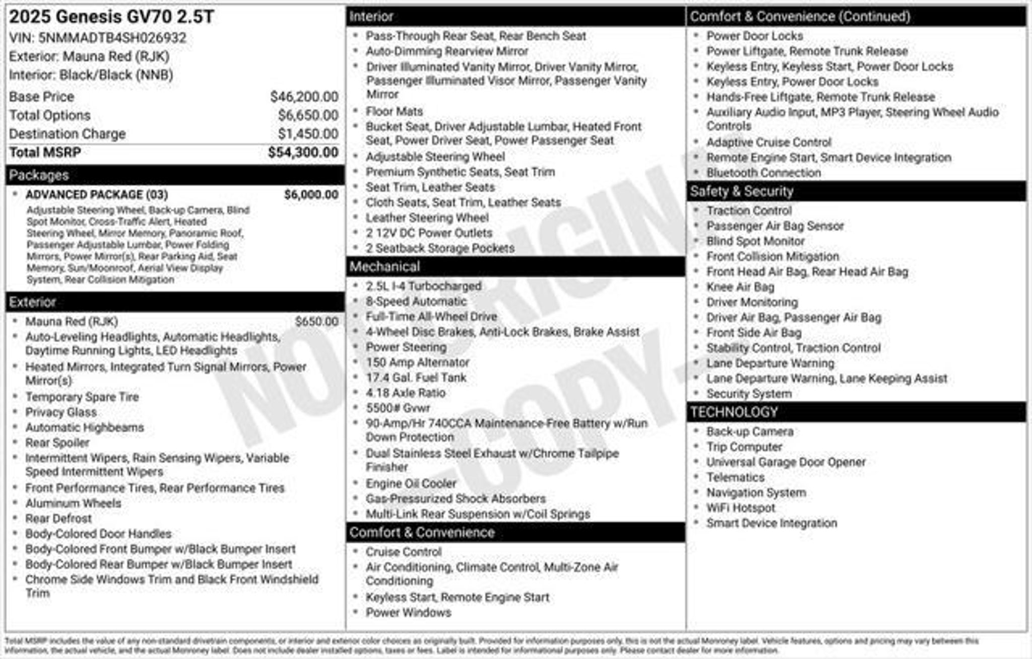 Discover the exceptional 2025 Genesis GV70 2.5T Advanced - a true testament to the brand's commitment to innovation and sophistication. This striking SUV boasts a captivating exterior in the bold Mauna Red hue, complemented by a suite of advanced features that elevate the driving experience to new heights. - Panoramic Sunroof - Blind Spot Detection - Navigation System - 20-Inch Wheels - AWD Slip behind the wheel and experience the seamless power of the 2.5L DOHC engine, paired with an 8-Speed Automatic transmission with SHIFTRONIC, delivering an exceptional balance of performance and efficiency. With an EPA-estimated 22 city / 28 highway MPG, this GV70 offers the perfect blend of dynamic driving and impressive fuel economy. The Advanced Package takes this GV70 to the next level, offering a wealth of premium amenities that cater to your every need. Enjoy the comfort of heated front seats, the convenience of a power liftgate, and the peace of mind provided by advanced safety technologies like Surround View Monitor and Reverse Parking Collision-Avoidance Assist. As a Genesis Certified pre-owned vehicle, this GV70 has undergone a rigorous 191-point inspection and comes backed by an exceptional warranty and roadside assistance program. With a Warranty Deductible of just $50 and coverage up to 120 months/100,000 miles on the powertrain, you can drive with confidence, knowing your investment is protected. Experience the exceptional craftsmanship, cutting-edge technology, and uncompromising attention to detail that define the 2025 Genesis GV70 2.5T Advanced. Visit our showroom today and discover the true meaning of luxury and performance in a pre-owned SUV.