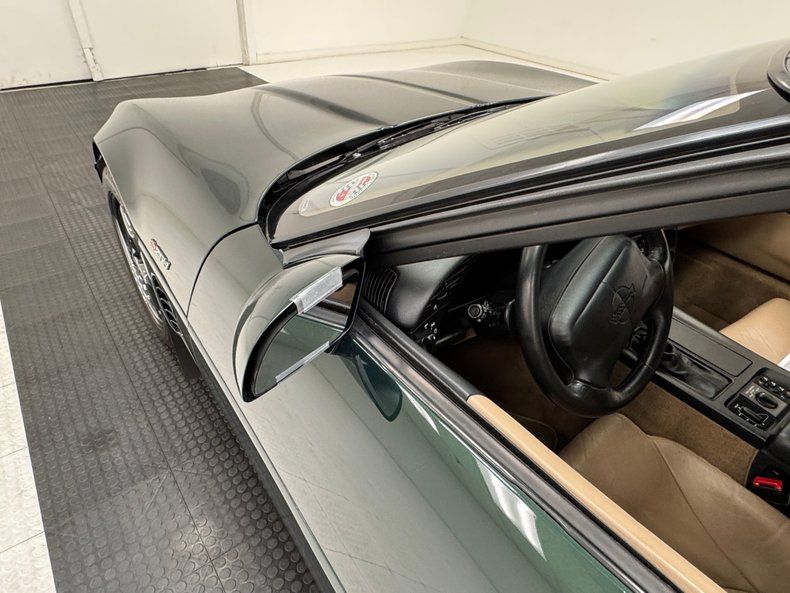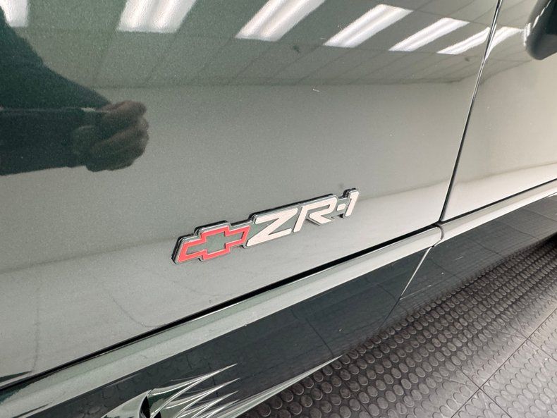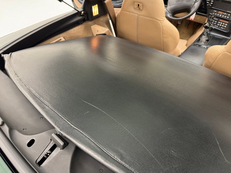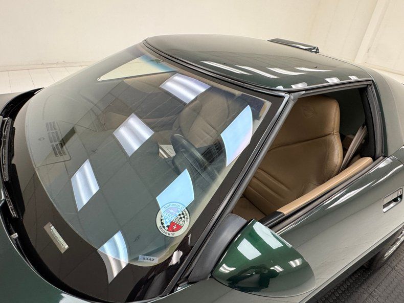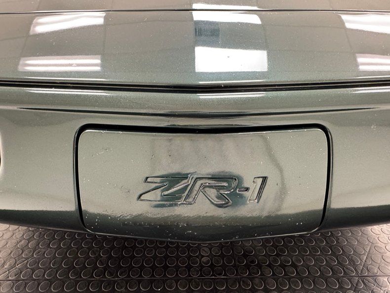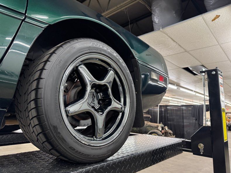 Deep and dark two stage Polo Green Metallic paint covers the car which from the front, looks like you run of the mill Corvette coupe. But get behind it, and the widened tail section tells a different story. Look closely and you'll find the ZR1 emblem on a rounded back with slightly squared dual tail lights and bevel cut twin exhaust tips for this American legend. In front, wrap around markers, introduced in '91, streamline the nose. 17-inch charcoal anodized wheels hold the staggered size tires that include wide 315/35ZR17 rears. Imperfections here include rock chips on the front, a side mirror held in place with tape, a series of sweeping scratches on the driver's door along with edge chips, curb rash, typical chin spoiler scratches, some evident repair on the left rear of the hood, and a gash in one tire. This Vette comes with both a solid and glass targa top.