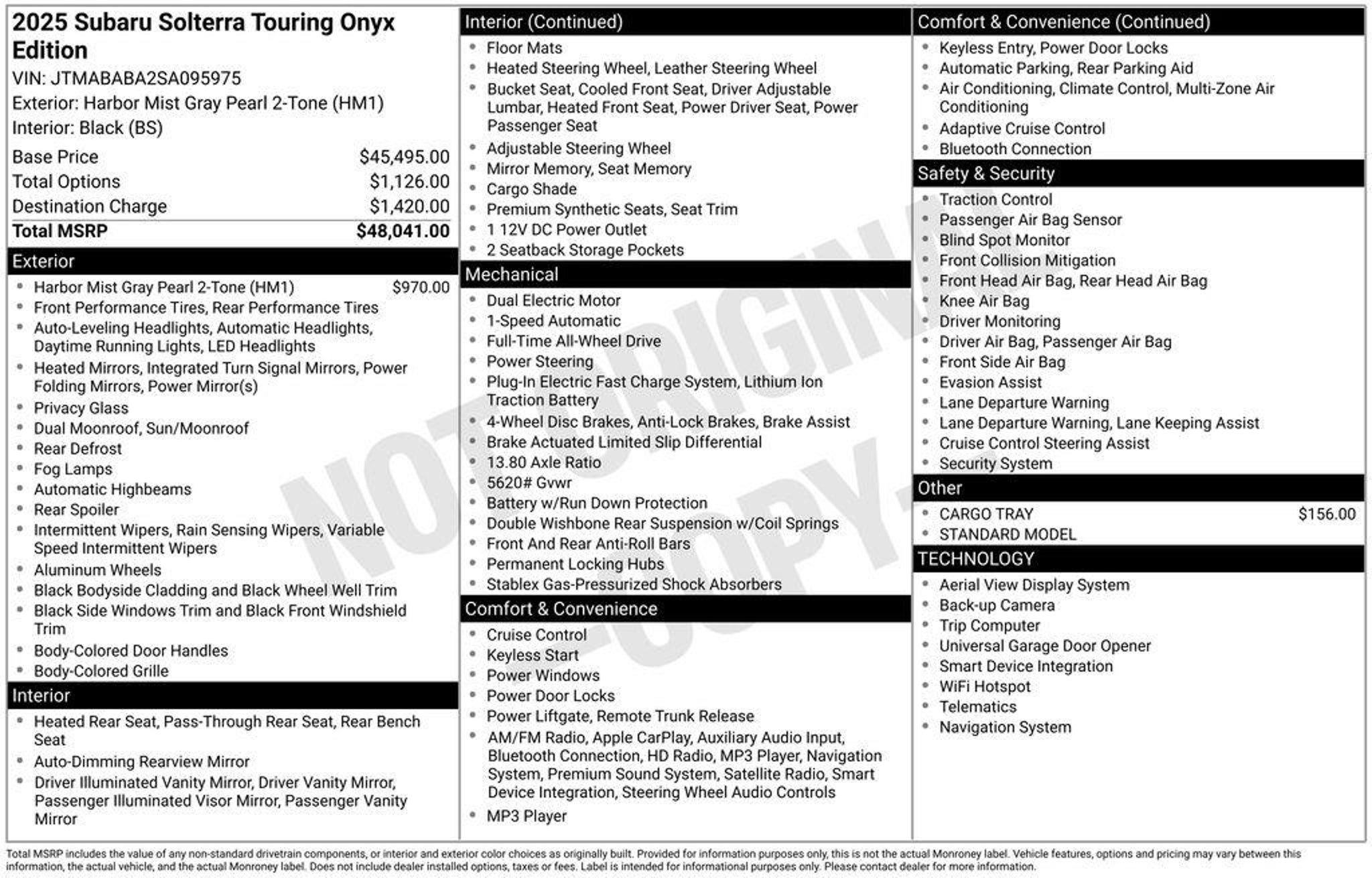 LOCATED AT: TACOMA SUBARU. 2025 Subaru Solterra Touring SUBARU CERTIFIED, REMAINDER OF FACTORY WARRANTY, INCLUDES WARRANTY. Recent Arrival! Clean CARFAX. CARFAX One-Owner. 111/93 City/Highway MPG Certified. Subaru Certified Pre-Owned Details: * SiriusXM 3-Month trial subscription, $500 Owner Loyalty coupon & 1 year trial subscription to STARLINK * Transferable Warranty * 152 Point Inspection * Powertrain Limited Warranty: 84 Month/100,000 Mile (whichever comes first) from original in-service date * Roadside Assistance * Warranty Deductible: $0 * Vehicle History Thank you for shopping at Tacoma Subaru! For car buyers who are looking for a honest and transparent experience, look no further. The Bruce Titus Automotive Group is a family-owned and operated business that puts customers first. Our goal is to provide a comfortable, hassle-free experience for our customers and to form relationships that last a lifetime. Our commitment to you does not end when you purchase your vehicle. Our transparent service and ownership experience help keep you and your vehicle safe on the road for years to come. DISCLAIMER: Dealer shall in no way be held liable for any errors or omissions to be found on these web pages. All prices are plus any applicable state taxes and fees. Prices are subject to change without notice. All vehicles are subject to prior sale. We will do our best to keep all information current and accurate, however, the dealership should be contacted by phone, e-mail, or in person for final pricing and availability. A dealer documentary service fee of up to $200 may be added to the sale price or capitalized cost. Vehicle may have dealer-installed accessories for display purposes only, and may not be reflected in Selling Price. All current incentives listed are purchase only. See dealer for lease incentives. Call for more info!