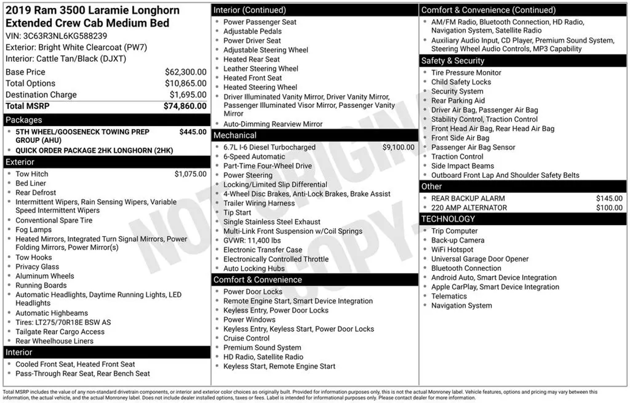2019 Ram 3500 4D Mega Cab Bright White Clearcoat 6-Speed Automatic Laramie Longhorn Odometer is 53974 miles below market average! 4WD Cummins 6.7L I6 Turbodiesel All prices plus tax, tag, and fees. New prices cannot be combined with special interest rates. Must finance through manufacturer's or dealer's preferred lender for certain rebates and some offers may not be combined. See Dealer for details. Important recall information: so you know, any used vehicle you may be considering may have unrepaired manufacturer?s safety recalls. To check the recall status repaired or unrepaired of the specific used vehicle you?re interested in purchasing visit www.safercar.gov. Thanks for shopping with us.