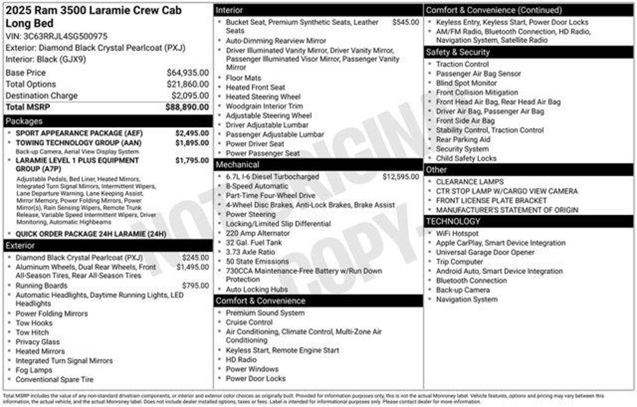Recent Arrival! Diamond Black Crystal Pearlcoat 2025 Ram 3500 Laramie 4WD 6.7L I6 Diamond Black Crystal PearlCoat Exterior Paint $245 3.42 Axle Ratio Towing Technology Group $1,595 SurroundView Camera System Trailer Reverse Guidance Trailer Tire Pressure Monitoring System Sport Appearance Package $1,295 BodyColor GrilleSurround Sport Performance Hood Laramie Level 1 Plus Equipment Group $1,795 Power Adjustable Pedals with Memory Dual Wireless Charging Pad Traffic Sign Recognition Deployable BedStep by Mopar Drowsy Driver Detection Active LaneManagement System Power Heat/Fold/Telescoping Memory Mirrors AutomaticDimming Exterior PassengerMirror Automatic AdjustinReverse Exterior Mirrors Auto Dimming Exterior Mirror Center Stop Lamp with CargoView Camera LeatherTrimmed Bucket Seats LED Bed Lighting RainSensitive Windshield Wipers Remote TailgateRelease SprayIn Bedliner by Mopar Adaptive Steering System 2ndRow InFloor Storage Bins 6.7L I6 Cummins HO Turbo Diesel Engine $12,595 3.42 Axle Ratio Chrome Flat CabLength SideSteps $795 Dual Rear Wheels $1,495 17Inch Steel Spare Wheel 17Inch x 6.0Inch Polished Aluminum Wheels LT235/80R17E BSW AllSeason Tires Center Hub Box and Rear Fender Clearance Lamps You can Fill out a Free Super Quick Pre-Approval Credit Application here! https://www.smartfordsouthboston.com/finance/apply-for-financing/ FINANCING FOR ALL TYPES OF CREDIT! SLOW PAYMENTS, BANKRUPTCY, REPOSESSION, COLLECTIONS, JUDGEMENTS, DIVORCE NO PROBLEM! MONTHLY PAYMENTS TO FIT ANY INCOME! TRADE-INS WELCOME! WE BUY CARS Everyday, Even if you don't buy ours! Prices do not include additional fees and costs of closing, including government fees and taxes, any finance charges, any dealer administrative fees, any emissions testing fees or other fees. All prices, specifications and availability subject to change without notice. Contact dealer for most current information. Laramie Level 1 Plus Equipment Group (#1 Seat Foam Cushion, 115V Auxiliary Rear Power Outlet, 2 Way Rear Headrest Seat, 2nd Row In Floor Storage Bins, 4 Way Front Headrests, Active Lane Management System, Adaptive Steering System, Auto Adjust In Reverse Exterior Mirrors, Auto Dimming Exterior Passenger Mirror, Auto High Beam Headlamp Control, Auto Power-Folding Mirrors, Auto-Dimming Exterior Mirrors, Bucket Seats, Chrome Exterior Mirrors, CTR Stop Lamp w/Cargo View Camera, Drowsy Driver Detection, Dual Wireless Charging Pad, Exterior Mirrors Courtesy Lamps, Exterior Mirrors w/Heating Element, Exterior Mirrors w/Memory, Exterior Mirrors w/Supplemental Signals, Foam Bottle Insert (Door Trim Panel), Folding Flat Load Floor Storage, Forward & Reverse Utility Lights, Front Seat Back Map Pockets, Full Length Upgraded Floor Console, Heated Front Seats, Heated Steering Wheel, High Back Seats, Leather Trimmed Bucket Seats, LED Bed Lighting, Mirror Running Lights, MOPAR Deployable Bed Step, MOPAR Spray In Bedliner, Power 2-Way Driver Lumbar Adjust, Power 2-Way Passenger Lumbar Adjust, Power Adjust 8-Way Driver Seat, Power Adjust 8-Way Front Passenger Seat, Power Adjust Mirrors, Power Adjustable Pedals w/Memory, Power Heat Fold Memory Telescopic Mirrors, Power Telescoping Mirrors, Power-Adjustable Convex Aux Mirrors, Rain Sensitive Windshield Wipers, Rear 60/40 Folding Seat, Remote Tailgate Release, and Traffic Sign Recognition), Quick Order Package 24H Laramie, Sport Appearance Package (Body Color Grille Surround, Sport Decal, and Sport Performance Hood), Towing Technology Group (Surround View Camera System, Trailer Reverse Guidance, and Trailer Tire Pressure Monitoring System), 10 Speakers, 4-Wheel Disc Brakes, 4G LTE Wi-Fi Hot Spot, 6000# Front Axle w/Hub Ext, ABS brakes, Air Conditioning, Alexa Built-In, Alloy wheels, AM/FM radio: SiriusXM with 360L, Apple C