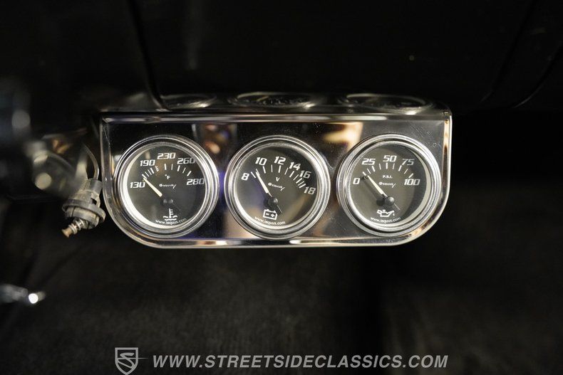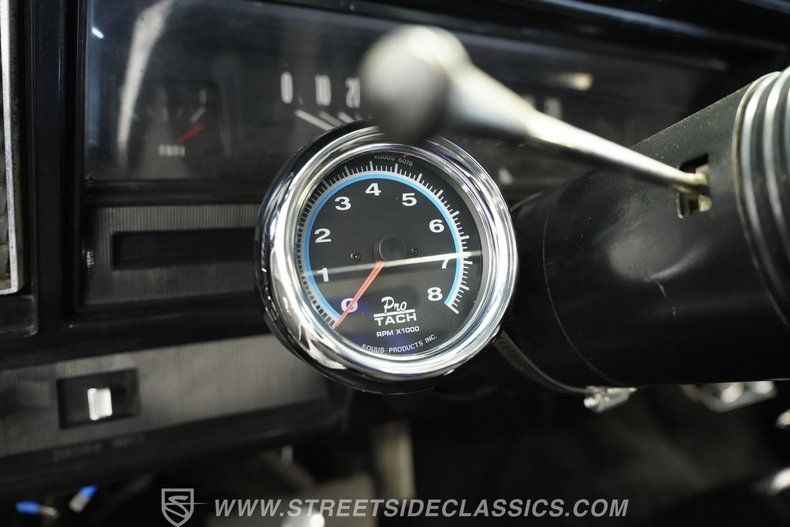 Slide into a cabin where classic design meets thoughtful upgrades. The black cloth bench seats offer a comfortable embrace for both driver and passenger, while tasteful interior accents like the Chevrolet badged aftermarket steering wheel and B&M floor shifter provide a tactile connection to the road. Modern gauges for water temperature, voltage, and oil pressure, along with a tachometer mounted on the steering column, keep you informed with vintage flair. The AM/FM stereo ensures your favorite tunes cruise along with you, enhancing every drive.