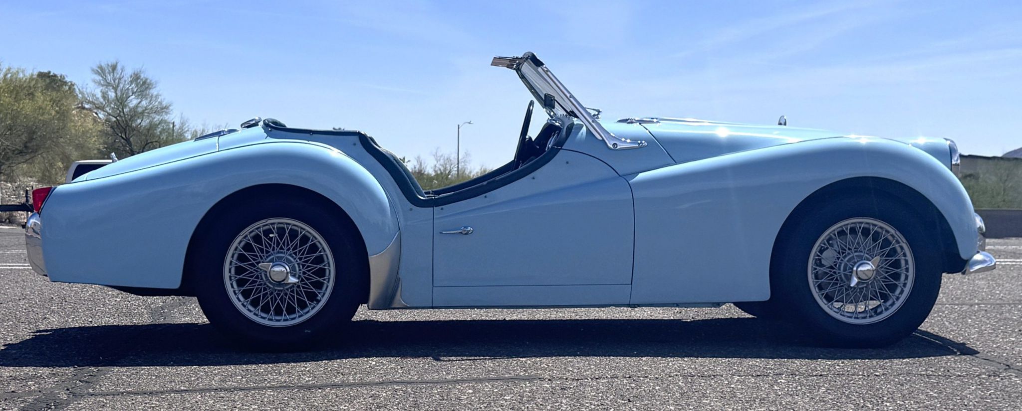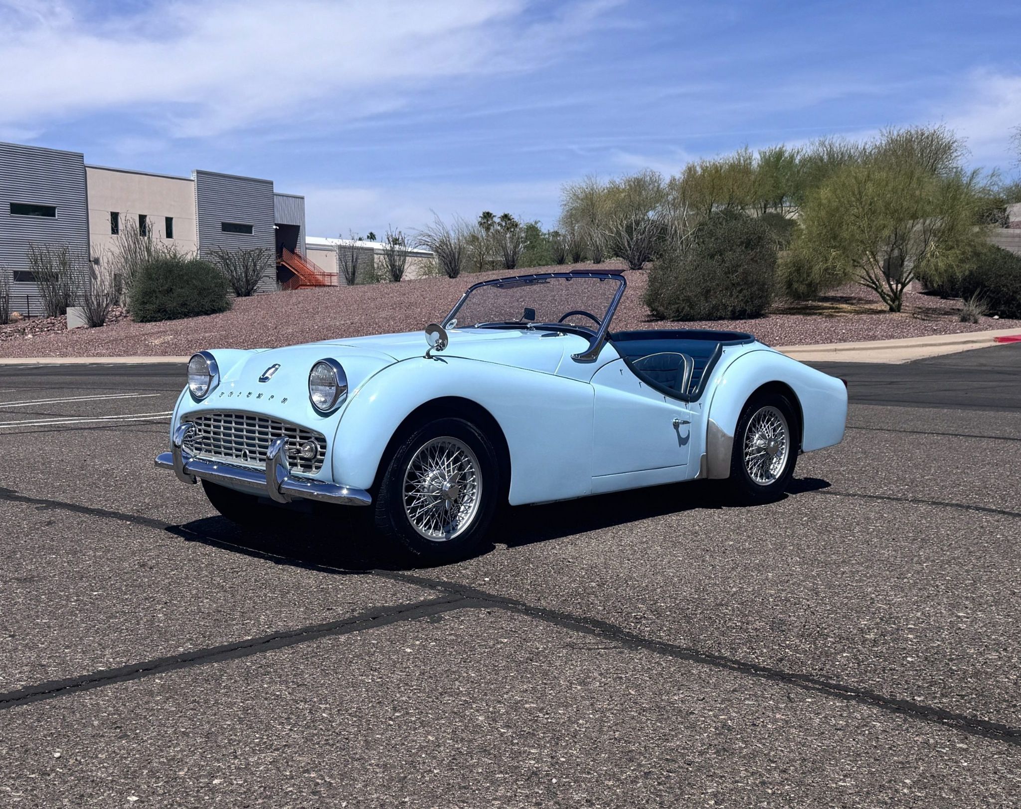 The 1963 Triumph TR3B Roadster is in excellent overall condition, matching numbers example and has desirable options any collector would be proud of! The TR3B has the inline four 2.2L engine paired with a four-speed manual transmission with overdrive. This TR3B presents in Powder Blue with dark blue interior and comes with hard top, soft top, side screens and tonneau cover. With its low-slung profile, wire wheels, and driver-focused cockpit, the Triumph delivers the engaging, elemental sports car experience that made the TR series so beloved. The 1963 Triumph TR3B represents the final evolution of the TR3 line, offering a rare combination of classic TR3A styling and the improved mechanical elements introduced in the TR4. As a final-year TR3B, this roadster is fitted with a badge from the Vintage Triumph Register and includes the British Motor Museum Heritage Certificate. The Triumph has its matching vin, body tag and engine number verified from the heritage certificate along with left-hand drive North American export specification, and original colors of powder blue with midnight blue trim and white weather equipment. The exterior of the Triumph is in overall excellent condition with powder blue paint showing a high-quality finish with minimal visible imperfections from age and normal use. The defining TR3 profile, characterized by sweeping fenders, a wide grille, and compact dimensions. Brightwork and trim present in great condition. The Triumph has Lucas driving lights and wire wheels with knock-offs fitted with Dunlop blackwall radial tires (165R15). The interior of the Triumph is finished in Navy Blue leather with white piping, presenting in excellent condition. The banjo steering wheel, chrome-rimmed speedometer, heater, windscreen washers, choke, and panel lighting and full complement of functional gauges. The left-hand-drive configuration enhances accessibility for U.S. drivers, and features such as the glovebox with chrome handle underscore the simplicity and charm of British sports car design. The cabin maintains the welcoming, purposeful feel that has long defined the TR roadster lineage. Power is supplied by the Triumphs inline 2.2L four-cylinder engine, producing approximately 105 horsepower. This TR3B is paired with a four-speed full-synchromesh manual transmission with upgraded overdrive, one of the TR3Bs most desirable upgrades. Front disc brakes and rear drums provide capable stopping power. The carburetor was rebuilt, choke assembly was rebuilt and serviced in September 2025. The Triumph delivers responsive handling and a classic open-air driving experience, summarizing the appeal of the final-year TR3B. The TR3B comes with a tool kit and service manual. For more information and details, please call or text Kendi Brown at 1.623.404.9042 or email us at sales@classicpromenade.com . This 1963 Triumph TR3B Roadster is available for inspection at our showroom in Phoenix. We are pleased to offer FaceTime or WhatsApp live video inspections, and we help coordinate shipping worldwide. We also have financing partners if you are interested in financing.