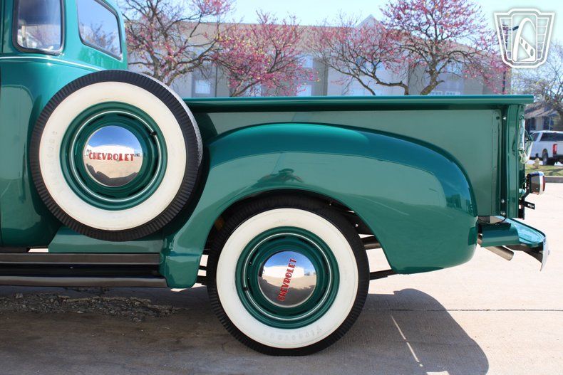 The gleaming hub caps and classic white wall tires complete the look, turning heads as you cruise through town or along a quiet country road. The combination of these details with the truck's timeless design creates an undeniable presence that draws admiration wherever you go. Whether you're rolling down Main Street or parked at a local gathering, this Chevrolet 3100 exudes character and charm.