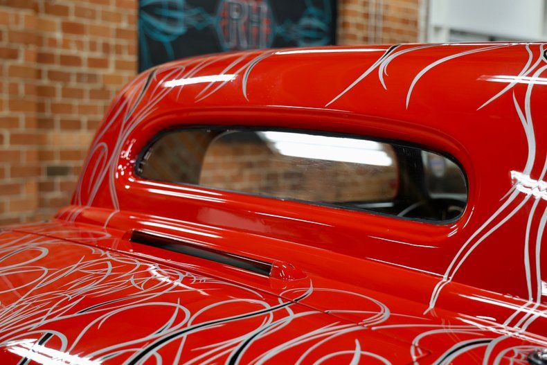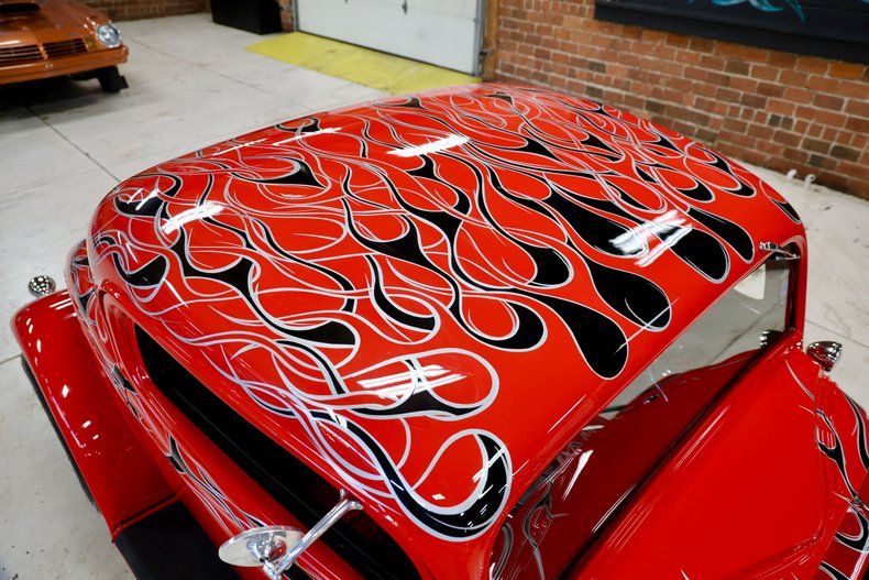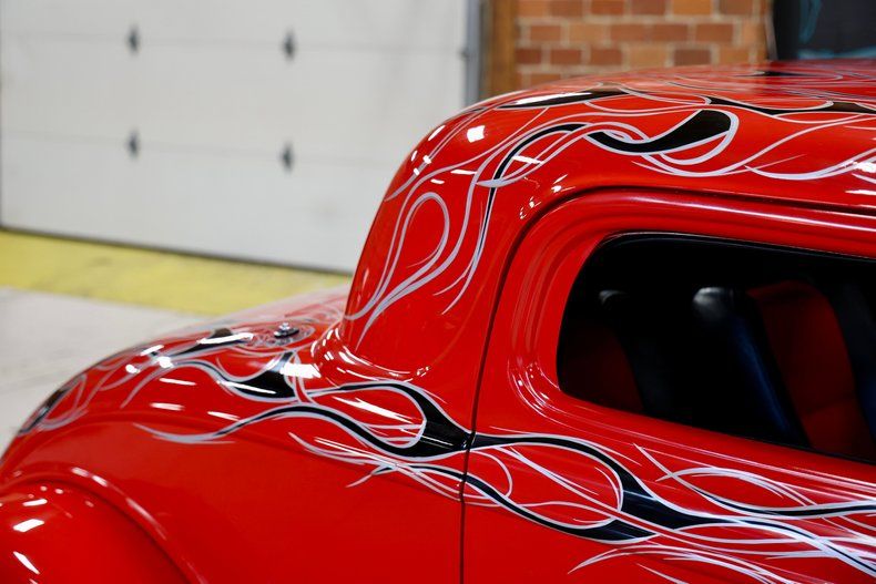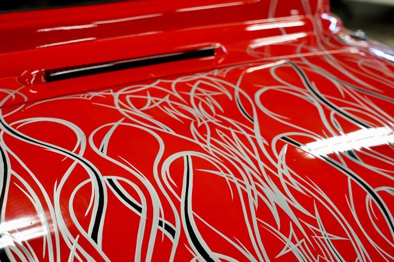 Exterior & Presentation The exterior is finished in a striking red paint scheme with black flames outlined in silver, extending across the body and even the underside, reflecting the attention to detail throughout the build. The coupe rides on American Racing Torq Thrust wheels, with 15-inch fronts and 17-inch rears, providing a classic stance with a modern touch.