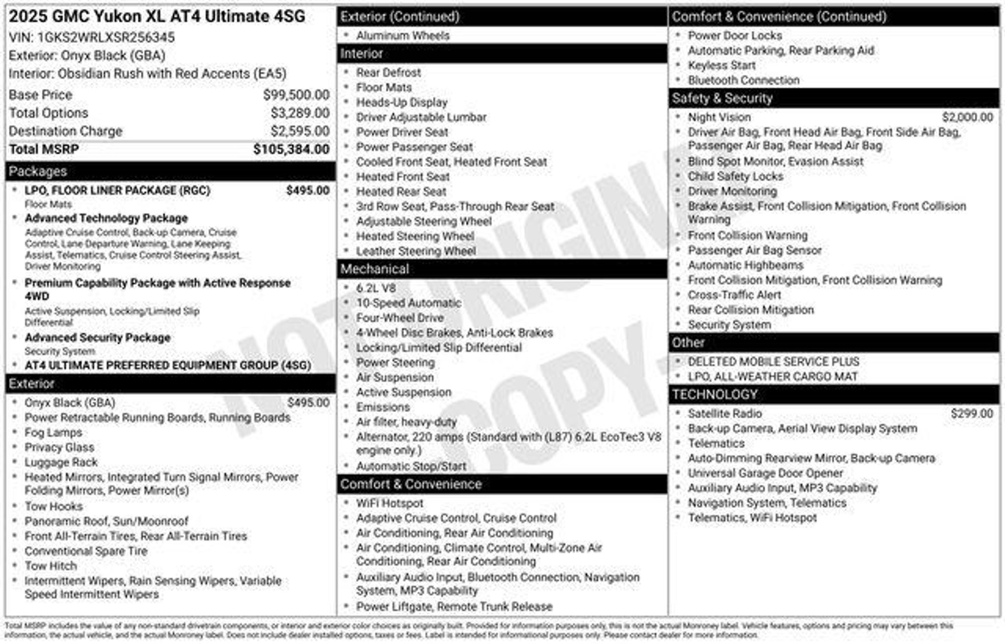 Recent Arrival! 14/18 City/Highway MPG Onyx Black 2025 GMC Yukon XL AT4 Ultimate 4D Sport Utility 4WD 10-Speed Automatic with Overdrive EcoTec3 6.2L V8 At Jenkins and Wynne each vehicle has a Safety Inspection and an Oil and Filter Change. In addition, any vehicle over 50k miles completes a Compression Check- checking the engine and transmission components. DOCUMENT FEE OF 890 APPLIES TO ALL VEHICLE PURCHASES. SEE DEALER FOR MORE INFO. Family Owned and Operated in Clarksville since 1953! Ask us about our '48 Hour Love It or Leave It- Price and Product Guarantee!' 15 Diagonal Multi-Color Head-Up Display, 18 Speakers, 1st and 2nd Rows All-Weather Floor Liners, 3 Years of OnStar Services/Safety Services, 3 Years SiriusXM, 3.23 Rear Axle Ratio, 3rd Row All-Weather Floor Liners, 3rd row seats: split-bench, 4-Spoke Leather-Wrapped Steering Wheel, 4-Way Power Driver Lumbar Seat Adjuster, 4-Way Power Front Passenger Lumbar Seat Adjuster, 4-Wheel Disc Brakes, 8 Diagonal Rear Touchscreen Climate Control, ABS brakes, Adaptive suspension, Advanced Security Package, Advanced Technology Package, Air Conditioning, Air Ride Adaptive Suspension, All-Weather Cargo Mat, Alloy wheels, AM/FM radio: SiriusXM with 360L, Apple CarPlay/Android Auto, Audio memory, Auto High-beam Headlights, Auto-dimming door mirrors, Auto-dimming Rear-View mirror, Auto-leveling suspension, Automatic temperature control, AutoSense Hands-Free Power Liftgate, Black Roof-Mounted Luggage Rack Side Rails, Blind Zone Steering Assist with Trailering, Body-Color Door Handles, Bose 18-Speaker Surround with Centerpoint, Brake assist, Bright Front and Rear Door Sill Plates, Bumpers: body-color, Compass, Delay-off headlights, Deleted Mobile Service Plus, Driver 2-Way Power Upper Shoulder, Driver Attention Assist, Driver door bin, Driver Power Massage Seat, Driver vanity mirror, Dual Exhaust System, Dual front impact airbags, Dual front side impact airbags, Dual-Pane Panoramic Power Sunroof, Electronic Limited Slip Differential (ELSD), Electronic Stability Control, Emergency communication system: OnStar and GMC connected services capable, Exterior Parking Camera Rear, Extra Capacity Cooling System, Floor Liner Package, Four wheel independent suspension, Front anti-roll bar, Front Bucket Seats, Front Center Armrest, Front dual zone A/C, Front fog lights, Front High-Approach Angle Fascia, Front Passenger 2-Way Power Upper Shoulder, Front Passenger Power Massage Seat, Front reading lights, Full Grain Leather Seats, Fully automatic headlights, Garage door tra