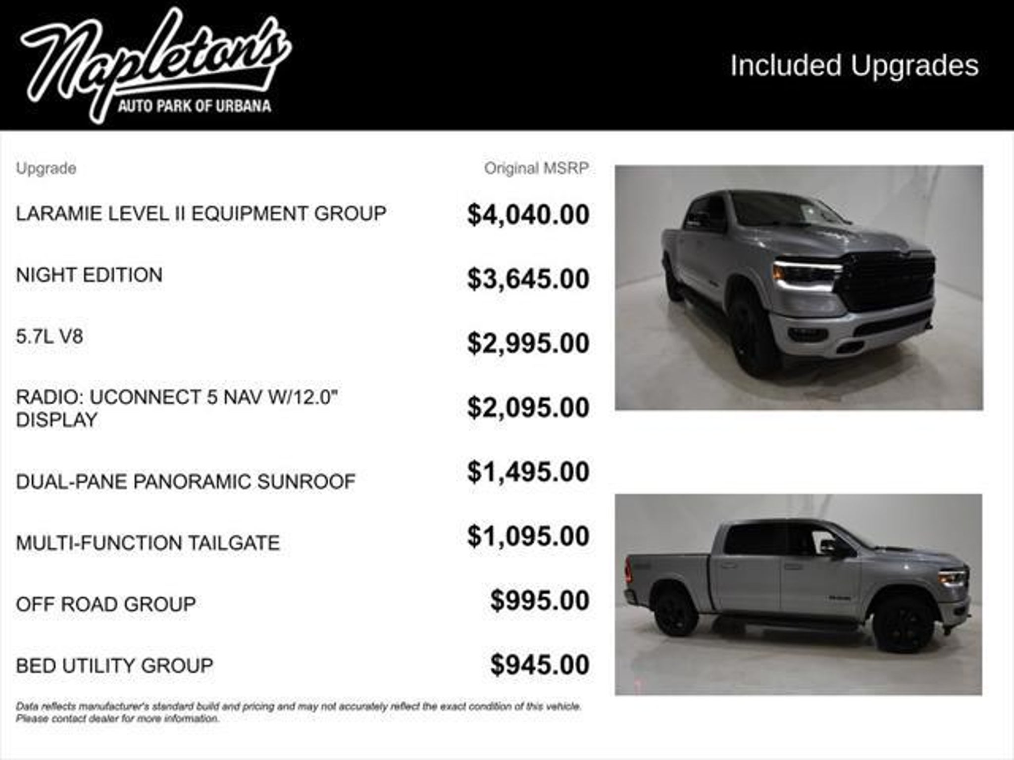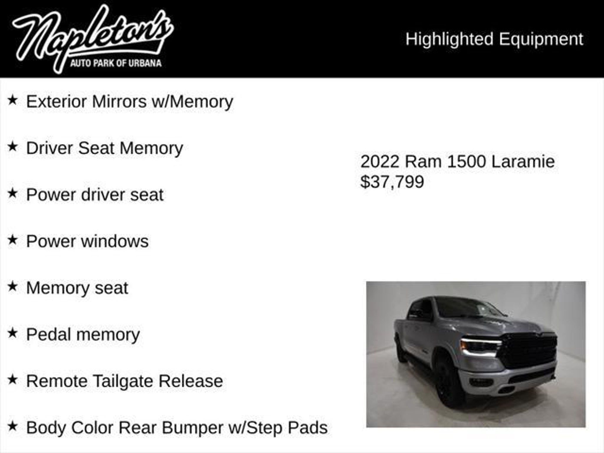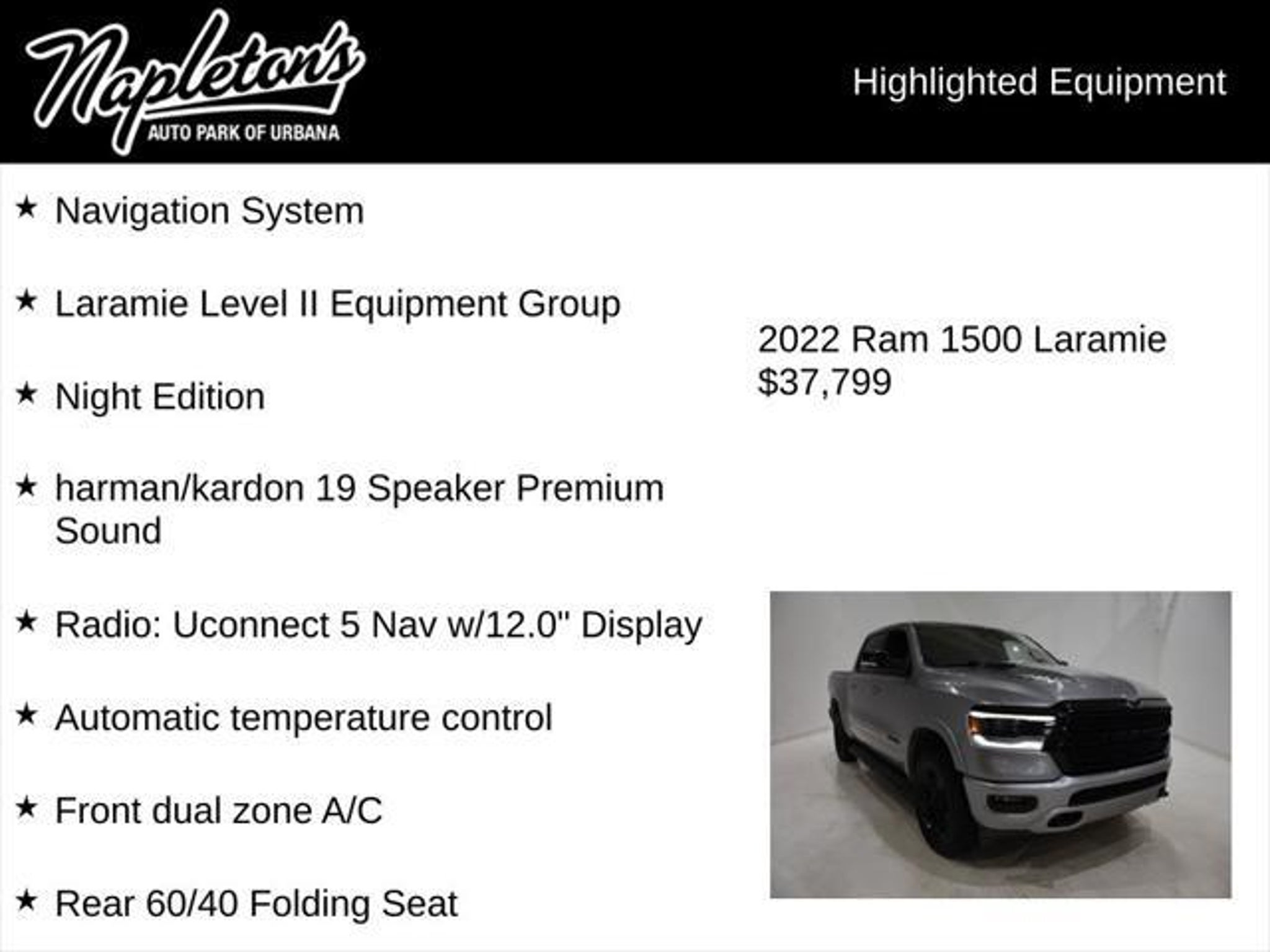 Discover the ultimate blend of power, technology, and style in this 2022 Ram 1500 Laramie with the Night Edition and Laramie Level II Equipment Group. This exceptional truck is a true standout, combining rugged capability with premium features that elevate your driving experience. - Dual-Pane Panoramic Sunroof - harman/kardon 19 Speaker Premium Sound - Radio: Uconnect 5 Nav w/12.0 Display - Blind Spot & Cross Path Detection - ParkSense Front/Rear Park Assist w/Stop - Wireless Charging Pad - Heated Steering Wheel - Ventilated Front Seats - Leather Trimmed Bucket Seats - Power 8-Way Driver & Passenger Seats - Wheels: 20 x 9.0 Premium Paint/Polished Powered by the legendary HEMI 5.7L V8 engine, this Ram 1500 delivers exceptional performance and efficiency, with a smooth-shifting 8-speed automatic transmission and capable 4-wheel drive system. The Off Road Group and Bed Utility Group further enhance its versatility, ensuring you can tackle any terrain or haul your gear with ease. The Night Edition package adds a bold, distinctive style, with a Sport Performance Hood, Black Exterior Accents, and Mopar Black Tubular Side Steps, while the Laramie Level II Equipment Group pampers you with premium amenities like the 12 Touchscreen Display, Blind Spot Monitoring, and Rain-Sensitive Windshield Wipers. Comfort and convenience are at the forefront, with features like Dual-Zone Automatic Climate Control, Heated and Ventilated Front Seats, and a Heated Steering Wheel. The Tri-Fold Tonneau Cover and MOPAR Spray-In Bedliner ensure your cargo stays secure and protected. Whether you're navigating the city streets or conquering the great outdoors, this 2022 Ram 1500 Laramie is the ultimate companion. Experience the perfect blend of power, technology, and style "“ schedule a test drive today and discover why this truck is the perfect fit for your lifestyle.