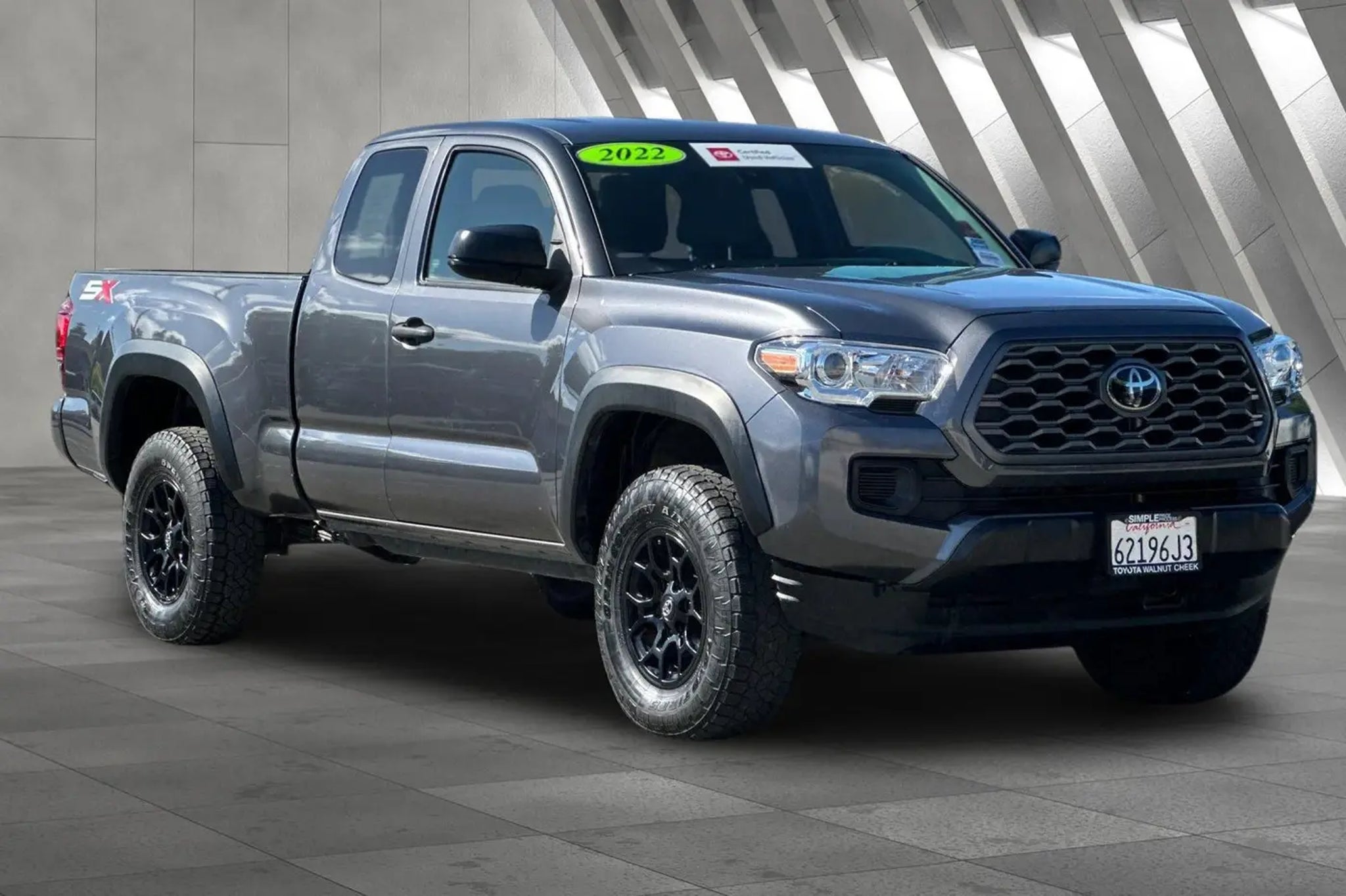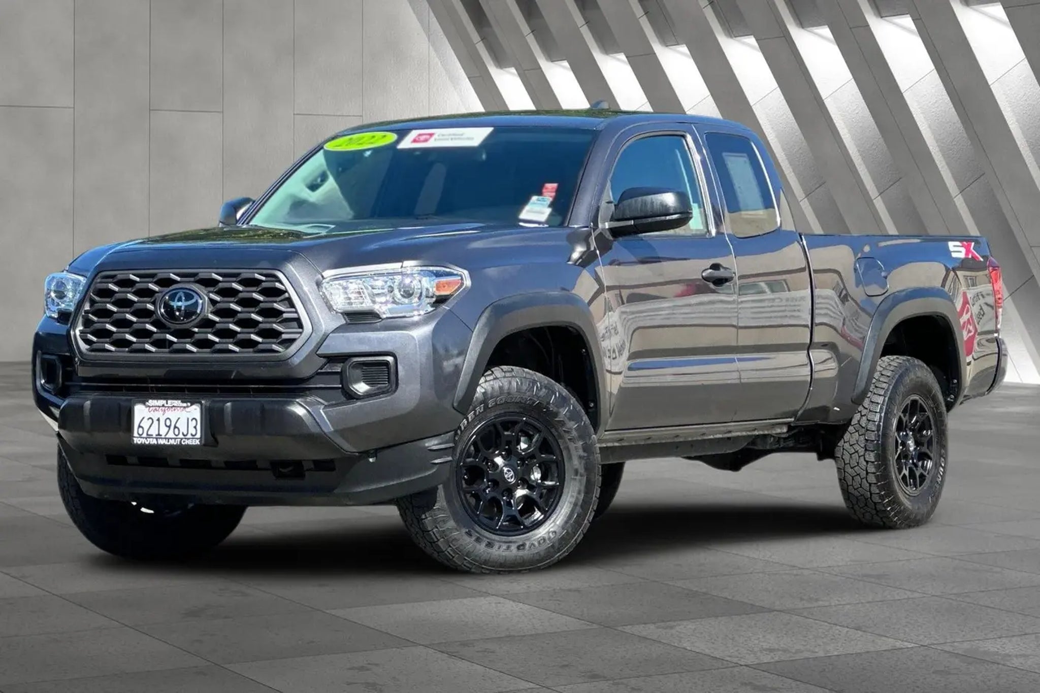 Accessories F FE 50 State Emissions F SX SX Package Black 16-in Alloy wheels, Overfenders, Mirror Caps, Door Handles, and Headlamps MECHANICAL & PERFORMANCE 3.5L V6 Atkinson Cycle with Dual VVT-i 6-Spd Automatic Transmission 4WDemand: Part-Time 4x4 Sys w/2-Speed Electronically Controlled Transfer Case Automatic Limited-Slip Differential Towing Receiver Hitch, Eng Oil Cooler, Trailer Sway Control SAFETY & CONVENIENCE Toyota Safety Sense P: Pre-Collision Sys w/Pedestrian Detection, Dynamic Radar Cruise Control, Lane Departure Alert, Automatic High Beams Star Safety System EXTERIOR 16-in Styled Steel Wheel INTERIOR Fabric-Trimmed Seats w/ Driver Lumbar Support Audio - 7-in Touchscreen, SiriusXM w/3-Month Platinum Trial, Android Auto & Apple CarPlay Compatible Dual Zone Auto A/C w/ Rear Vents, Tacoma SR V6, 4D Access Cab, 3.5L V6 PDI DOHC 24V LEV3-ULEV70 278hp, 6-Speed Automatic, 4WD, Magnetic Gray Metallic, Cement Cloth. Certified. Toyota Gold Certified Details: * Warranty Deductible: $0 * Transferable Warranty * 160 Point Inspection * Roadside Assistance * Limited Warranty: 12 Month/12,000 Mile Limited Comprehensive Warranty: 12 Month/12,000 Mile (whichever comes first) from certified purchase date * Vehicle History * Roadside Assistance for 7 Year / 100,000 Mile. Standard New-Car Financing Rates Available. Warranty honored at over 1,400 Toyota dealers in the continental U.S. & Canada. Trade-ins accepted. Trouble-free handling of your transaction, including DMV paperwork * Powertrain Limited Warranty: 84 Month/100,000 Mile (whichever comes first) from TCUV purchase date Clean CARFAX. Simple Price, Simple Process.