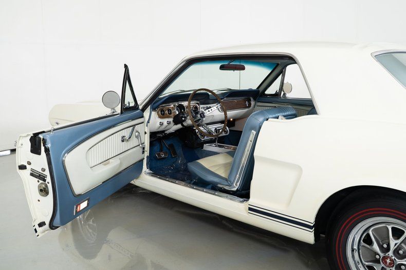 Finished in Wimbledon White with black rocker stripes, this 65 Mustang has the clean, iconic look that defined the early Mustang years. The stance is completed with 14-inch styled steel wheels wrapped in new dual redline tires, giving this 1965 Mustang the right period correct presence.