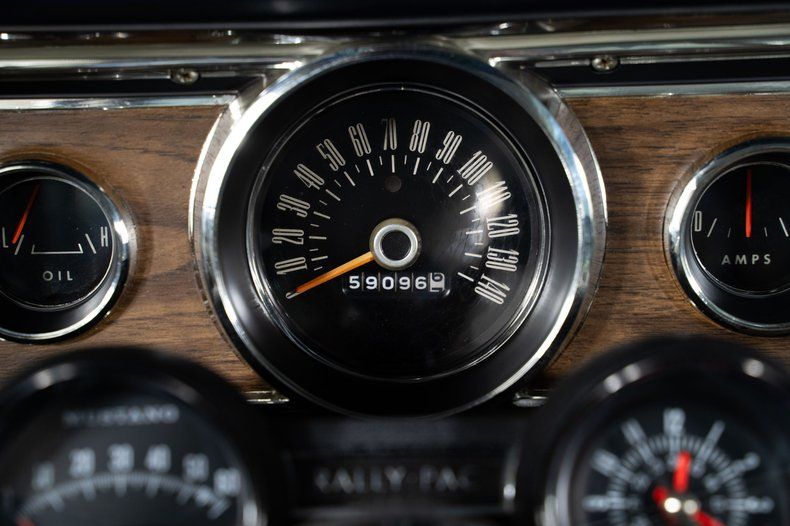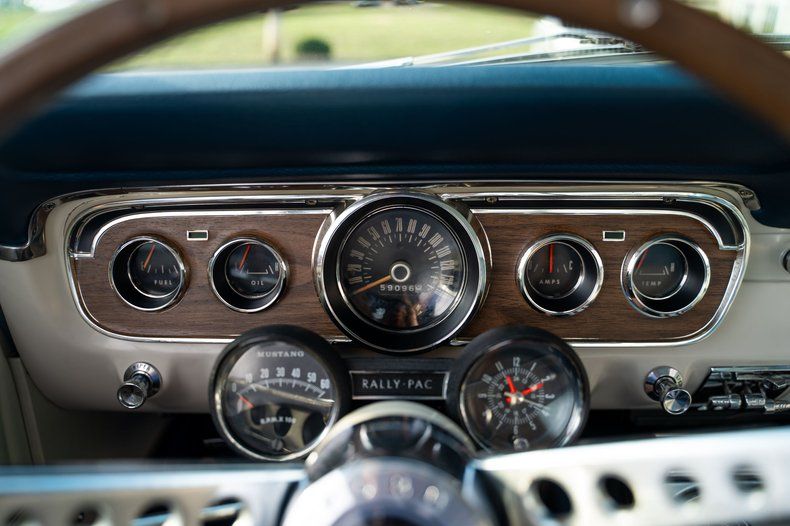 Inside, the blue-and-white deluxe Pony interior with center console sets this classic Mustang apart. Power steering, power brakes, and air conditioning make this Mustang for sale comfortable and easy to drive, and the Rally Pack gauges add both style and function to the cockpit.