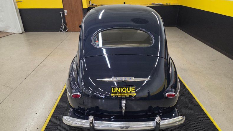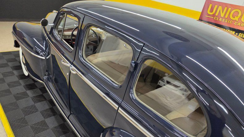 1947 Ford Deluxe four-door sedan. Dark navy blue with a considerable amount of shiny brightwork and chrome, such as the front grille, bumpers, and headlight surrounds. Under the hood sits the iconic 239 cubic inch flathead V8 engine paired with a 3-speed manual transmission mounted on the steering column, commonly referred to as a "three-on-the-tree." The vehicle retains many original features including its oil bath style air cleaner, 6-volt electrical system, and original style gauges. The exterior condition is mostly clean, with minor imperfections. Riding on wide whitewall radial tires. Equipped with suicide-style rear doors, offering spacious access to the interior, which features a neutral cloth interior with a standard 1940s dashboard layout and rubber flooring. The engine compartment is tidy with a recent battery installation. The flathead V8 runs smoothly with oil pressure and temperature gauges behaving normally. During the test drive, the car demonstrates good braking, smooth clutch and transmission operation. A well-maintained classic car that is ready for casual driving and cruising with ample room for passengers.