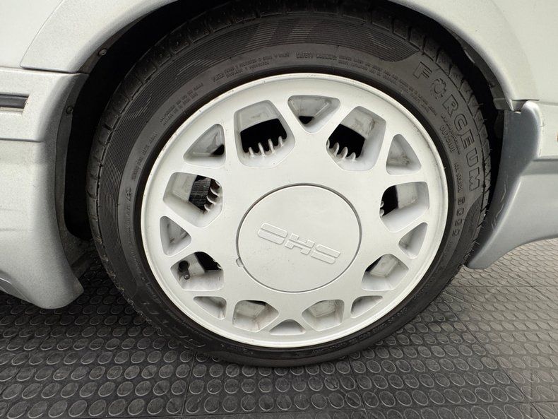 Resprayed at some point in Silver, this two stage coat now covers the lower panels as well which were typically black from the factory. While the typical front fascia bears a slight resemblance to American Fords at the time, this one is fitted with the Sierra Cosworth front grille and headlights giving a slightly more exotic and aggressive look. Meanwhile the fixed rear windows would look odd on their own, Merkurs came with an epic biplane rear spoiler that made the rear instantly cool and distinct, shared in a different configuration by the stablemate SVO. The latch panel and rear tail lights can be described as Saab-like but the twin chrome tips of the exhaust and added rear splitter take this car to a new level of performance. Ford shows some interchangeability with the 16-inch Turbo Thunderbird wheels and SHO center caps added by our consignor that look fitting. Imperfections include scuffs on the right fender, paint chips on front bumper, some curb rash, chips in original wheel coating painted over, bent or cracked plastic cladding, various chips, rock chips, scratches, touch ups, and chin scrapes.