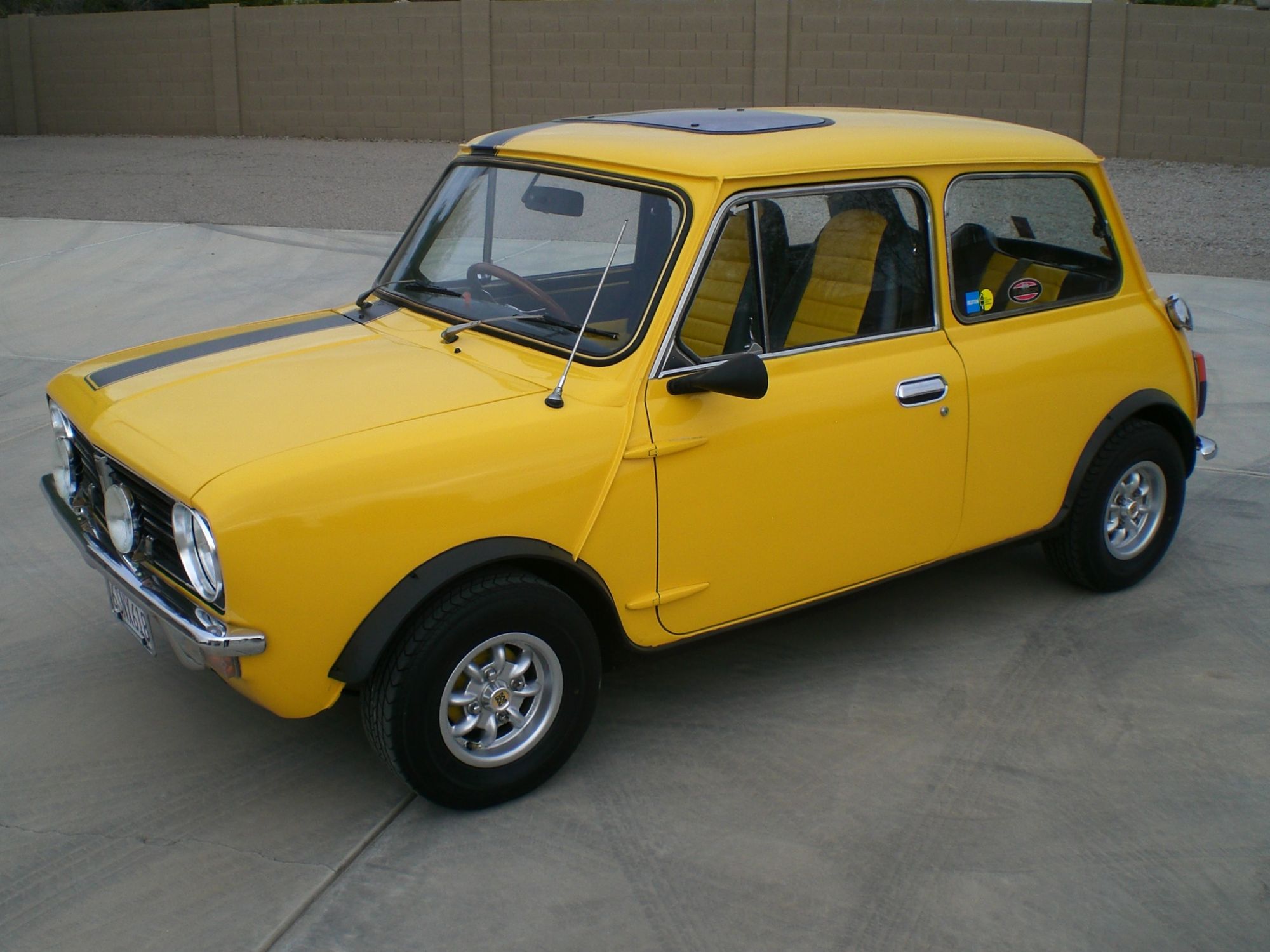 ![]() Click on the image for a larger picture. 1973 MINI This 73 Austin Mini has the 1,275 c.c. engine with dual SU carbs. Its quick, agile and fun to drive. The Mini-lite wheels are shod with radials acquiring a solid grip of the road. Interior is finished in black and yellow vinyl. Right hand drive might seem foreign to some but my only confusion is the turn signal lever on right side of column. The flip sunroof is not factory but adds a flair of air. Get attention and have fun with this little honey for only $12,500.
