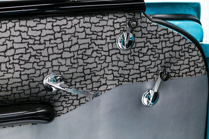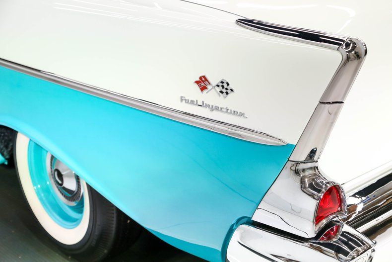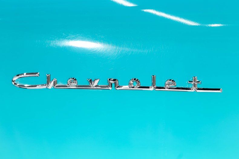 EXTERIOR: All the sheet metal is original to this car. It was stripped down to bare. The panels fit precisely. Repainted it's original Tropical Turquoise- India Ivory colors using PPG Deltron. It was sanded and buffed to a better than new finish. Painted 30 years ago and it still looks amazing, that's a real testament to it's quality. Original Fuel Injection emblems were on the 1/4 panels on the 150 only, all others were on the fenders. The holes look factory, not drilled. The chrome was redone by Royal Silver. It has original California 1 piece bumper. Buff it Bob restored the stainless trim. All new glass. The weatherstrips and seals were all replaced. Being the base model it has minimal trim, no rubber tips on the front bumpers, no reverse lights. It also has painted rims with poverty caps. They did splurge for a set of white walls.