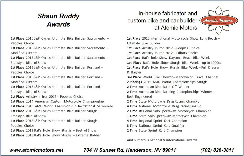 Shaun Ruddy is a Worldwide award winning motorcycle builder, with his motorcycles on television shows, magazines & featured in motorcycle museums in the USA, Australia, China & Europe.