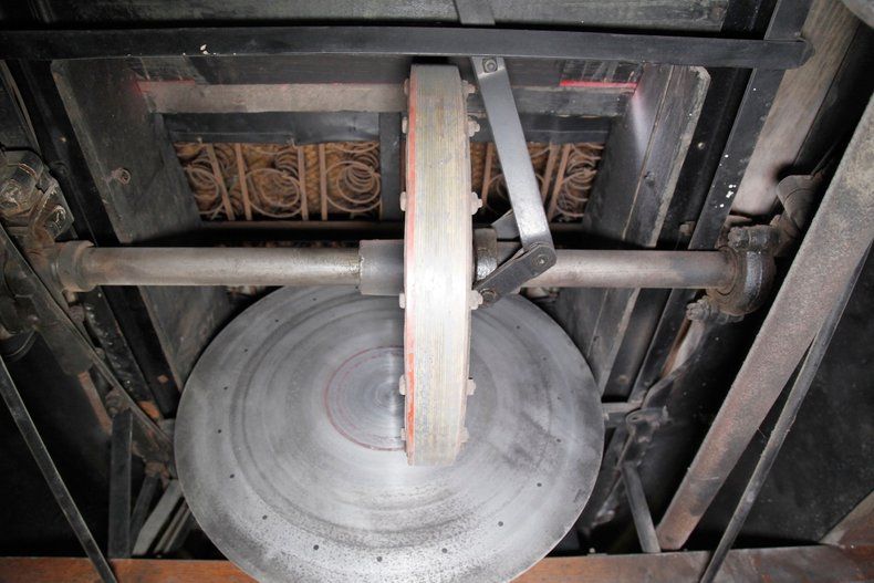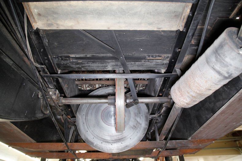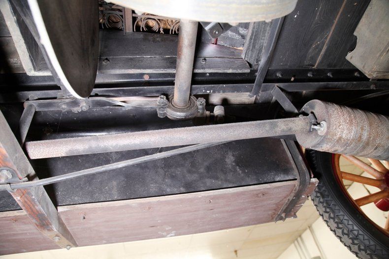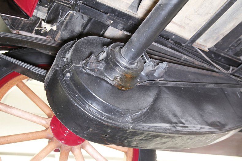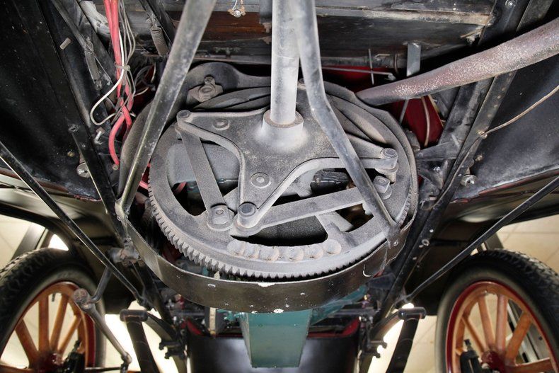 This is where things get interesting, featuring a 188.7ci L-head 4 cylinder. This aqua painted mill is fed by a 1bbl carburetor, and a direct-drive shaft leads rearward. New ideas were in vogue during the early days of motoring and Metz was far ahead of its time. In place of a traditional transmission, or even a planetary style transmission we see a simple steel disc. A drive wheel, actuated by the shift lever above is designed to move inward and outward on the steel disc thus increasing rotational speeds sent to the 4.00 geared rear axle via the single drive chain. A precursor to the CVT transmissions of today if you will. Absolutely one of the nicest drivetrain restorations I've seen come through the doors here at Classic Auto Mall. With supple hoses and wires this engine is in near Concours condition.