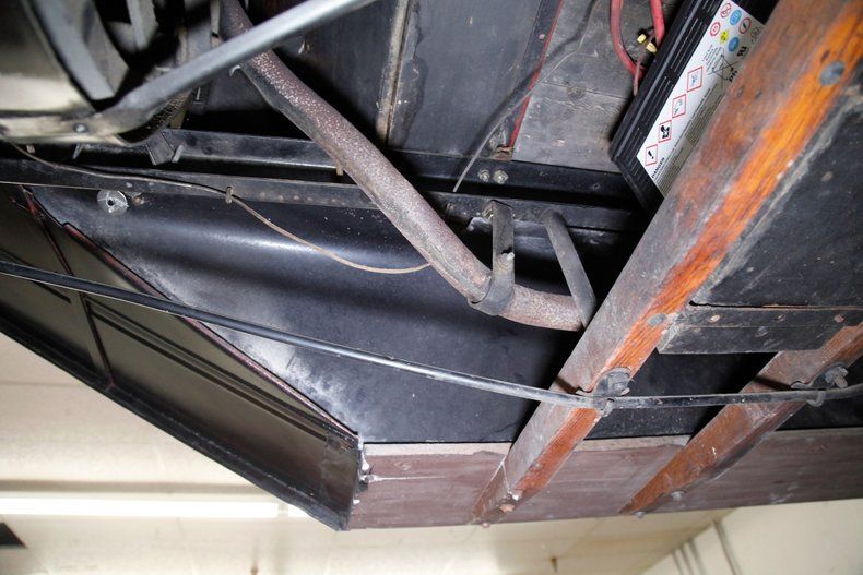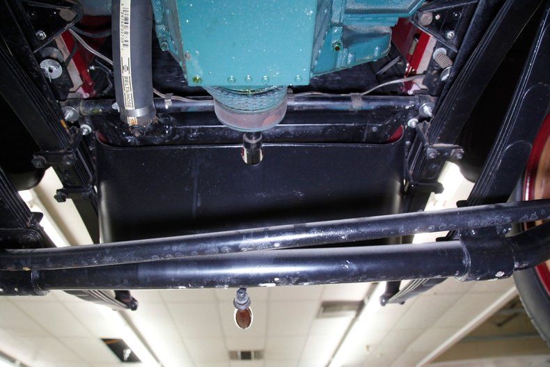 A straight total rust-free environment under here with jet black metal with a light coating of dust and patina from age. This car was a pre 4-wheel braked car, only sporting mechanical rear drum brakes. All leaf spring suspension, and all amazingly shiny.