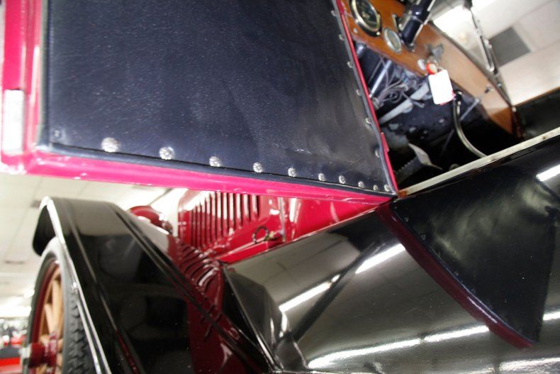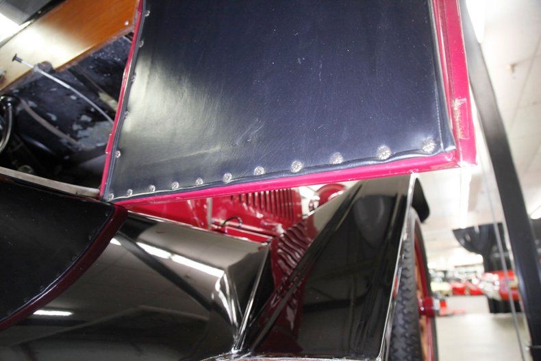Automobiling was in its growth spurt in the 19-teens with over 485,000 of the world's 606,000 cars having been produced in the good old US of A. With its simply designed "tub" this 4-door convertible touring sedan is straight, and the paint is maroon on the body which presents nicely. Curvaceous fenders attached to long running boards adorn each side of this tub and are sprayed in black. These running boards have highly lacquered wood inlays for the steps which highlight the black steel perfectly. The long hood in its cowling style is fronted by a maroon radiator surround, Metz badging, and brass radiator cap. 2 simple large brass trimmed can headlights flank the grille, and float above the front fenders. Black canvas makes up the foldable roof over the passengers and shows without any flaws. In the back attached to the body tub is a single spare tire and a small round taillight decorates the driver's rear fender. 30" glossy wood spoke wheels adorn the 4 corners and are shod in 30x3.5" blackwall rubber.