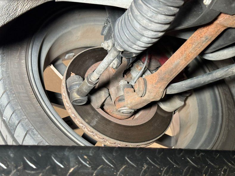 Up on the lift some slight surface rust but all structurally sound with the unibody construction. All independent suspension, and all power disc brakes all around for this car. Adjustable coilovers are in front, and lowering springs are in back. Noted, there is still a noticeable bend in the left front unibody rail near the radiator support (see photos 68 and 69).
