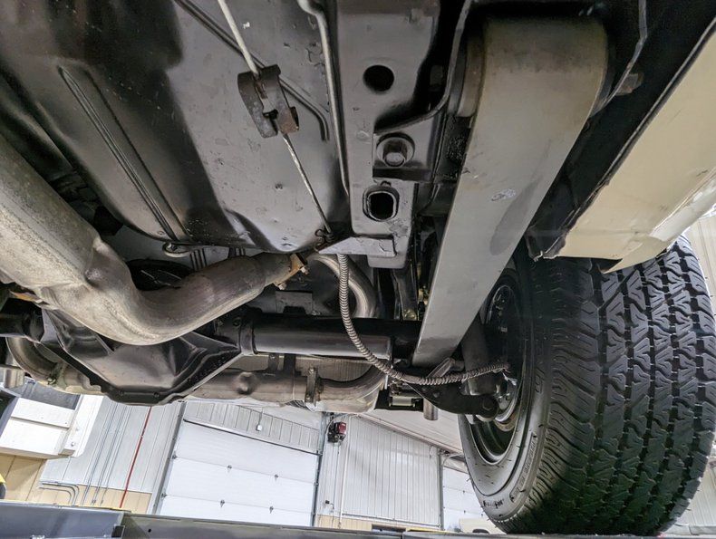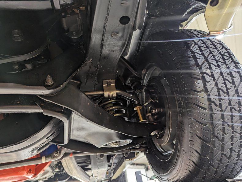 UNDERSIDE: The frame and all the components were removed from the bottom of the car. The floors are dry, clean metal all painted semi-gloss black. It all went back together with rebuilt or new components. The steering and suspension were rebuilt. It has the factory traction bar that was only used on high performance Camaros. It also has the performance chambered exhaust system. The brake system was restored, e-brake is hooked up. The fuel system was replaced. Looking up at the motor it is clean Chevy orange with a proper starter. It has a correct dated Muncie M20 4-speed trans. Rebuilt drive shaft leads to the 12 bolt rear end.